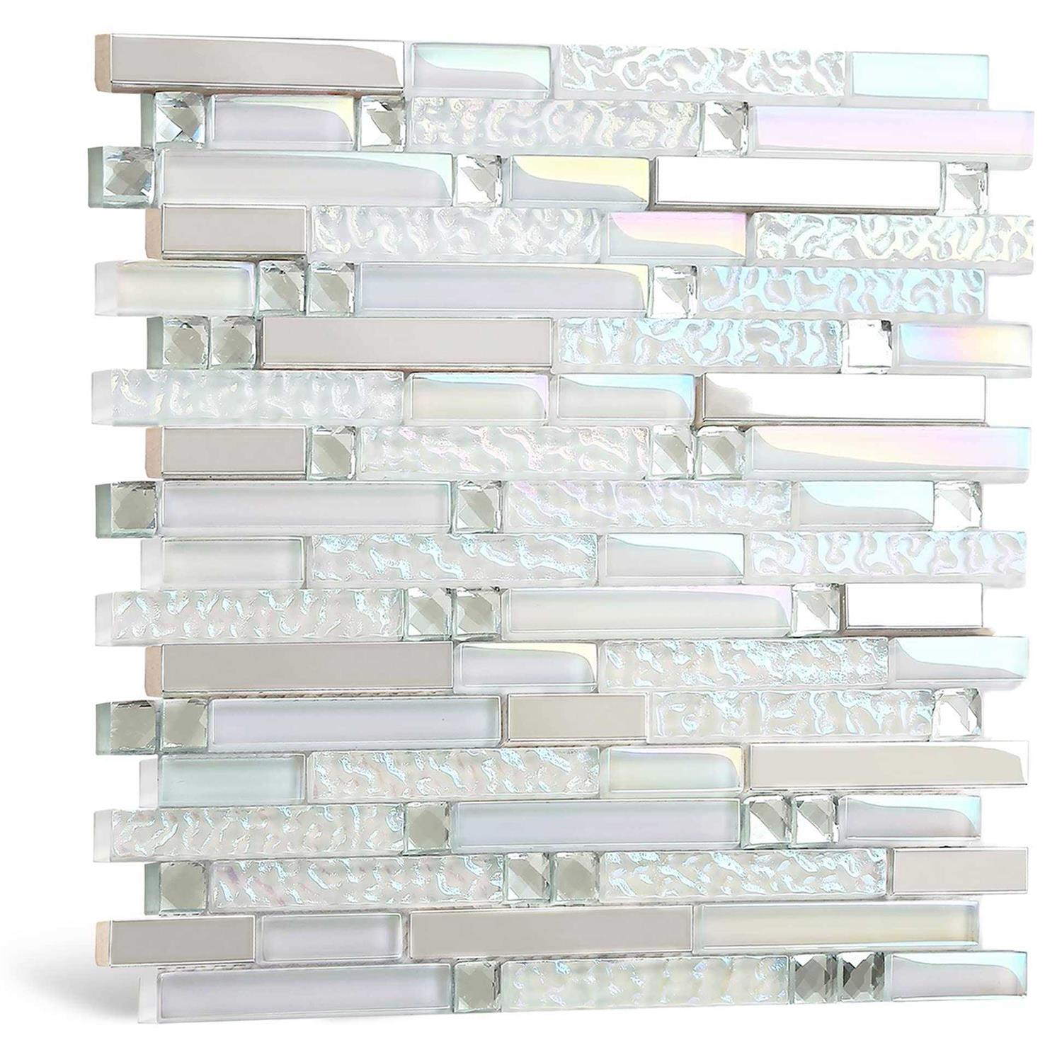 Blujellyfish Glass Metal Tile Iridescent White Glass Silver Mirror Stainless Steel Blends Interlocking Strip Wall Tiles TSTNB01