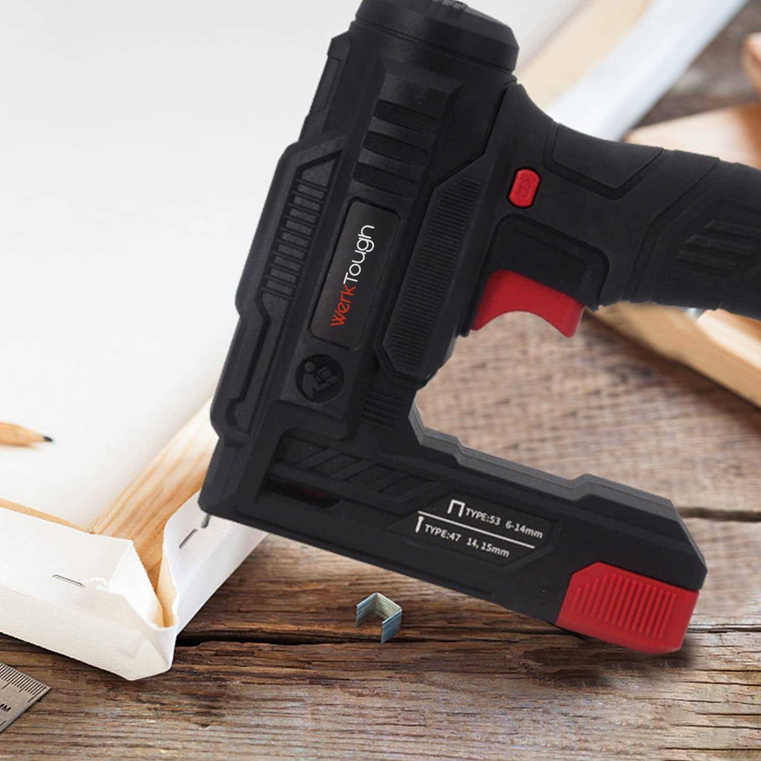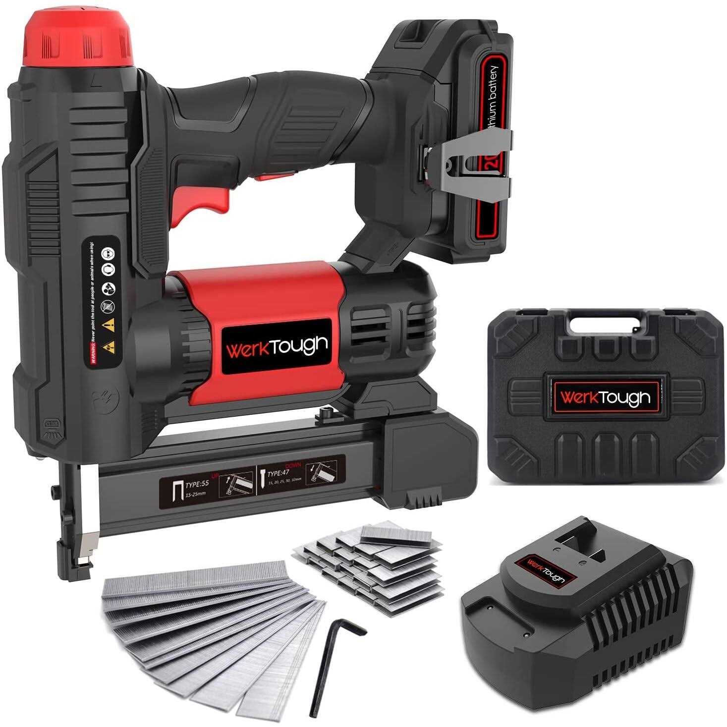 Werktough 20v Cordless Staple Gun Brad Nailer 2 in 1 Aluminum Metal magzine 1 Hour Fast Charger 2000mA Lithium Battery 2000pcs Free Staples
