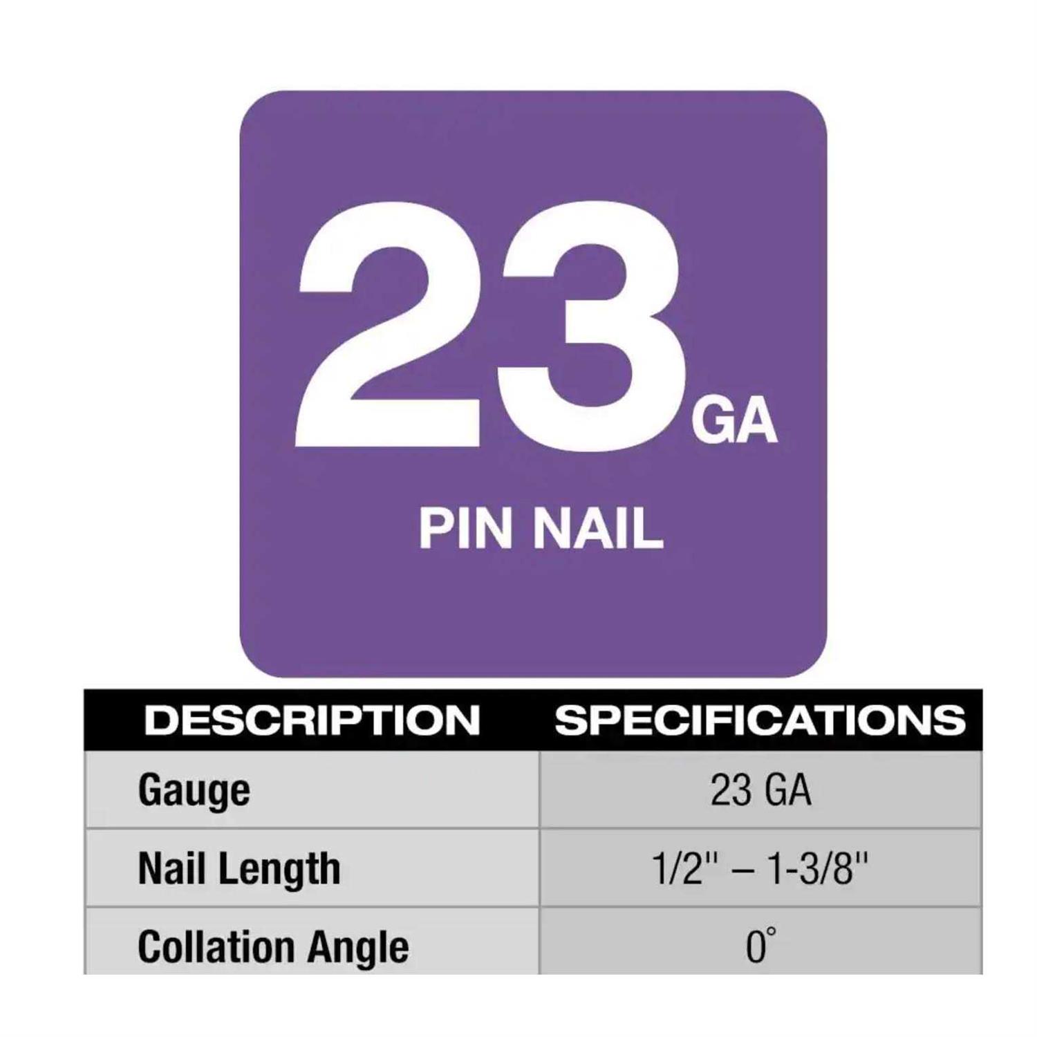 This M12 cordless rechargeable finishing gauge pin nailer is made of reinforced nylon and has a D-handle. It has a nail length ranging from to 1 inches and a capacity of 120 nails. The kit operates at 12V DC, 23 gauge, and a strip adhesive collation straight angle. It has a shank diameter ranging from 0.64 millimetre and meets the UL standard.