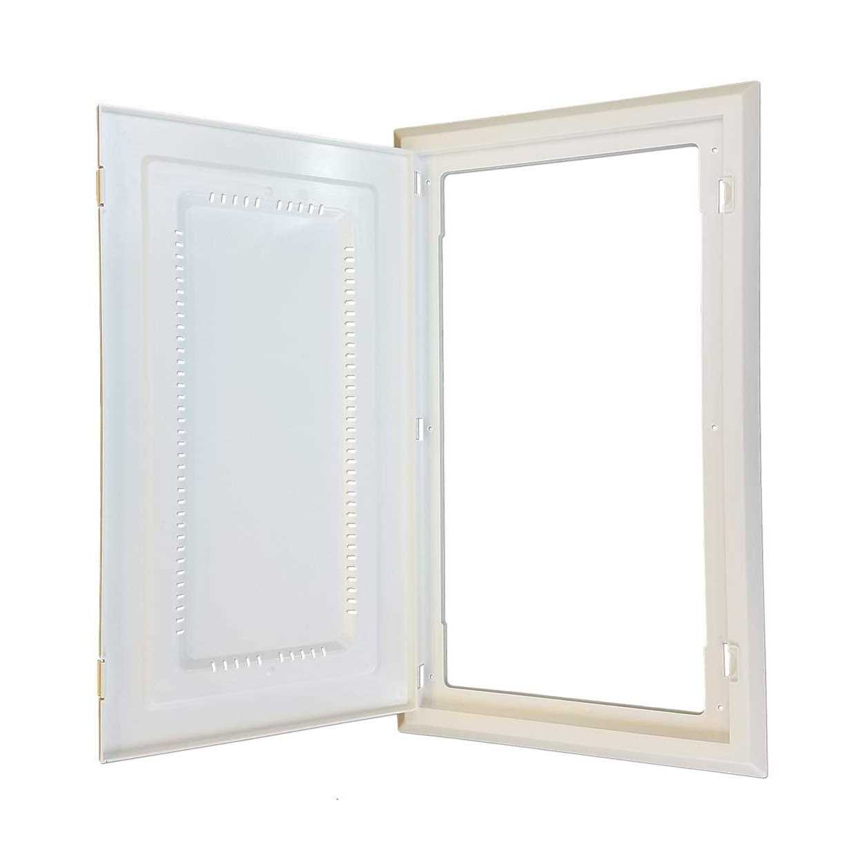 Features a hole pattern that accepts most major brands of modules to be installed (28″ interior height) Durable polypropylene construction DOES NOT BLOCK WiFi SIGNAL! Enclosure mounts prior to drywall, between 16″ center studs (mounting tabs on side); Ventilated hinged door comes standard and can be installed to open from the left or right side. The body assembles easily using flexible hinges to fold the box into shape, with locking insertion tabs used to secure the sides of the box. The tabs extend outward as mounts for attaching to 16″ center studs during installation. The interior back features a universal mounting pattern that accepts most communication modules. The ventilated, hinged lid and frame (included, pre-assembled) are made from non-conductive ABS plastic, allowing the enclosure to be WiFi transparent when used for housing network hardware. The frame and lid with dual latches are intended to be flush-mounted after drywall installation.