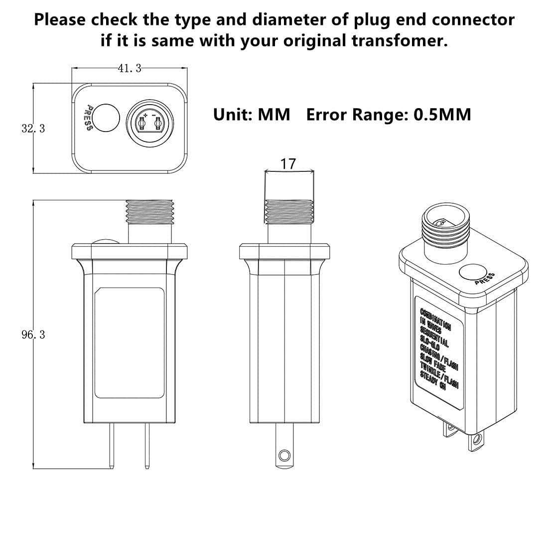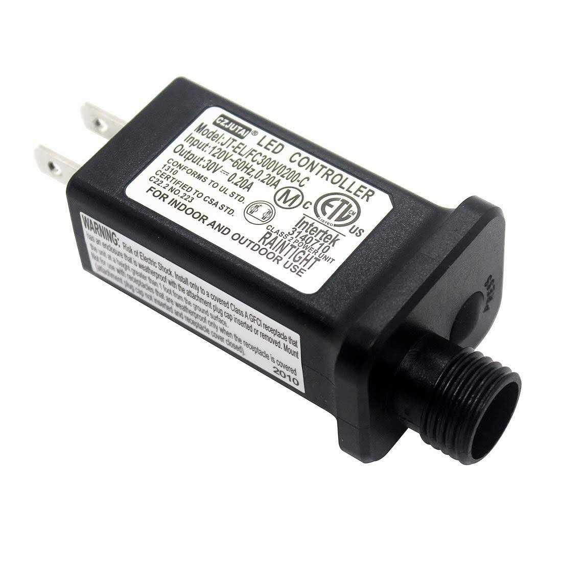 Model:JT-EL/FC300V0200-C Input: 120V, 60HZ, Output: 30V, 0.2A, 6 Watts This 30V LED adaptor with 8 modes and memory functions, they are combination, in waves, sequential, slo-glo, chasing/flash slow fade, twinkle/flash, steady on. This adaptor fits for 30V low voltage led device with current under 6 watts, such as 30V 6W Christmas String Lights, Copper Wire Light, Projector Light.