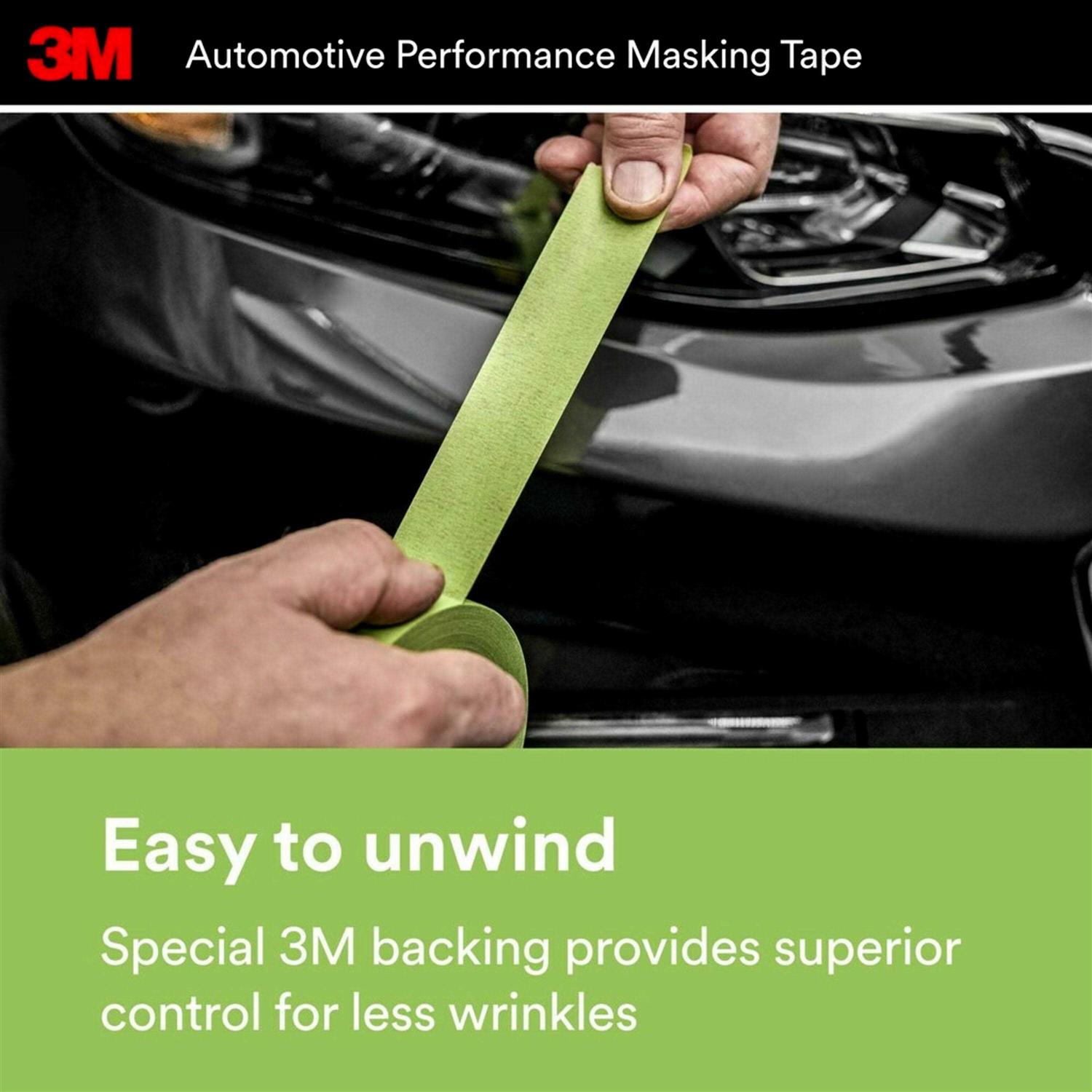 Quality automotive masking tape Provides excellent adhesion to a variety of substrates Provides a sharp paint line Removes cleanly upon completion of the job Resists lifting and curling 3M Automotive Performance Masking Tape is recommended for critical masking applications in which clean paint lines are essential. The specially formulated adhesive sticks to most surfaces and removes cleanly after up to 5 days. Excellent resistance to paint bleed-through and good temperature resistance of up to 250 degrees (short term exposures) makes this tape a favorite for automotive body restoration projects. The tape is manufactured in an ISO 9002 registered plant to meet worldwide quality standards.