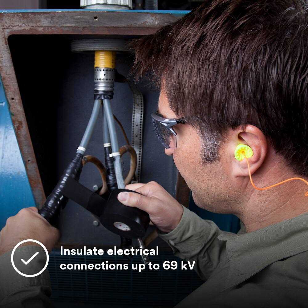 Scotch Self-Sealing Ethylene Propylene Rubber Tape 130C is a self-sealing ethylene propylene rubber based insulating tape with excellent electrical and dielectric properties. At 80 to 100 percent elongation, the individual winding layers join together to form a homogeneous winding without air pockets. Thus, it is excellently suited for winding on primary insulations at connections and terminations of plastic-insulated cables in the medium-voltage range up to 69 kilovolts – and especially for sealing coaxial connectors at antennas and cable entries. The rubber tape is resistant to moisture, diluted acids, weathering and UV radiation. It is also compatible with all cable sheathing materials. Since it has no liner, it is particularly easy to process. The 0.76 millimetre thick insulating tape has a dielectric strength of up to 35 kilovolts per square millimetre. It is self-extinguishing and, with a temperature resistance of up to 90 °C, belongs to insulation class Y.