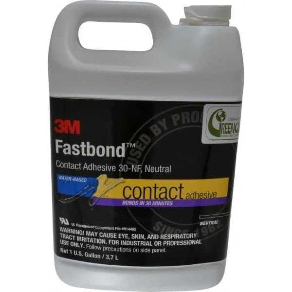 Acrylic Adhesives by 3M. Details: 3M Fastbond Contact Adhesive 30NF is a low-odor, water-based, adhesive designed to have high strength, high coverage, long bonding range and good heat resistance. This classic adhesive has proven to bond combinations of most foamed plastics, plastic laminate, wood, plywood, wood veneer and canvas. 3M Fastbond Contact Adhesive 30NF creates a very high strength, high temperature resistant bond with up to a 4 hour bonding range. Ideal for decorative laminate applications where non-flammability and low VOCs are critical. Post-formable and heat resistant, it is non-flammable in the wet state, which may help reduce risk of fire and help keep manufacturers in compliance with insurance regulations. Not recommended for drywall laminating or for bonding metal surfaces.