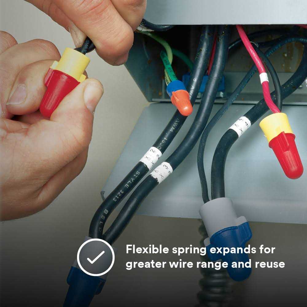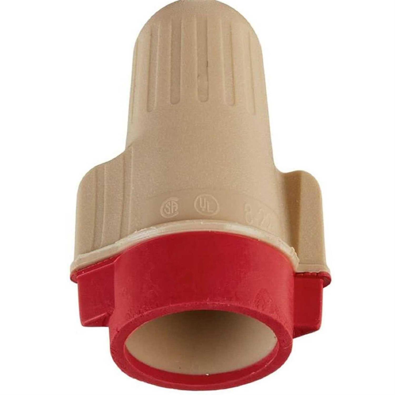 Tan/red Wire Conn 100/box Smooth, comfortable feel, with a quick bite active (live) spring. Corrosion resistant coating design, compact size and red miniskirt. Wire range of 2 number 18 and up to 5 number 12. Replaces the yellow, tan or red connectors in the majority of all fieldapplications. Copper conductors only, No. 22 thru No. 8 solid and/or stranded. Wing design for a better grip. Voltage rated 600 volt maximum building wire and 1000 volt maximum signs and lighting fixtures. Maximum operating temperature of 221 degrees F.