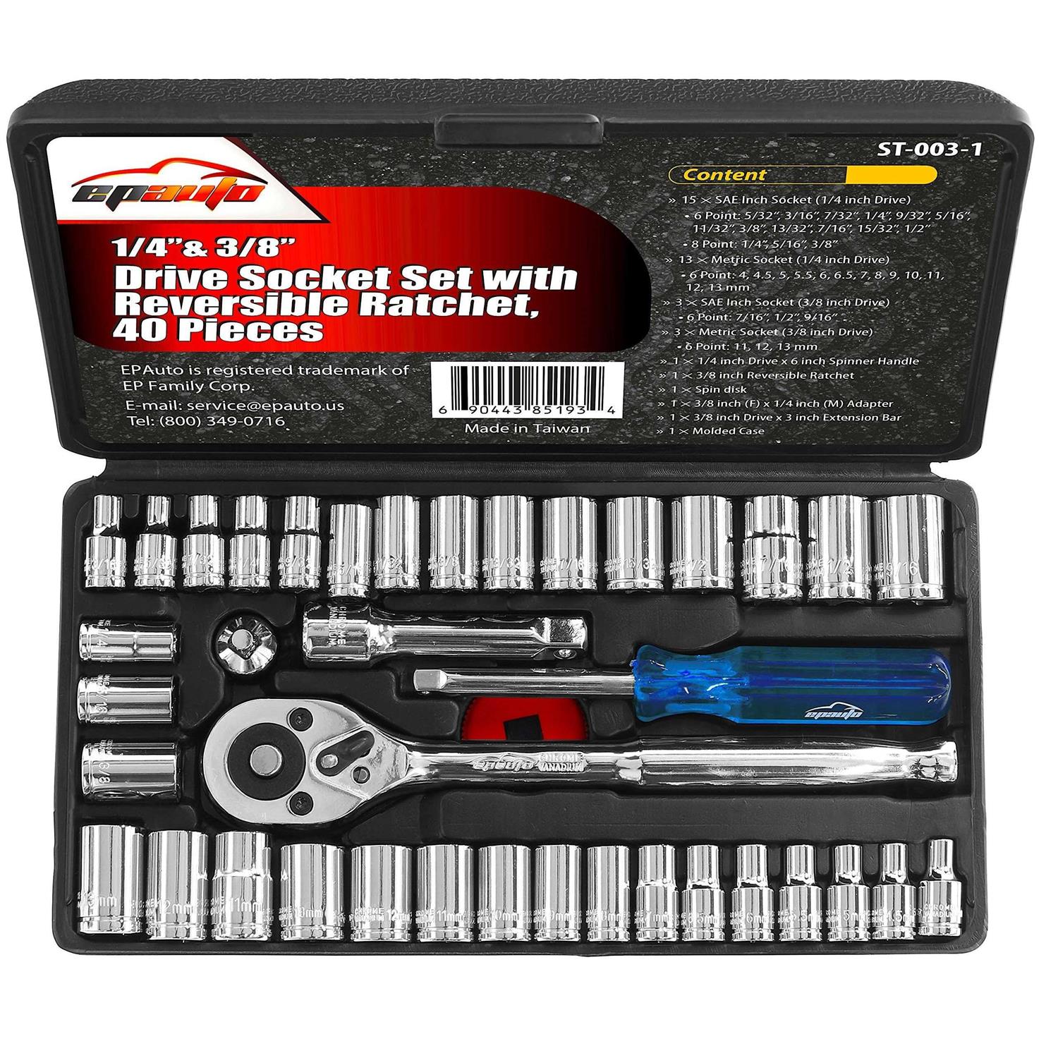 40 Pieces EPAuto 1/4-Inch & 3/8-Inch Drive Socket Set with 72 Tooth Reversible Ratchet