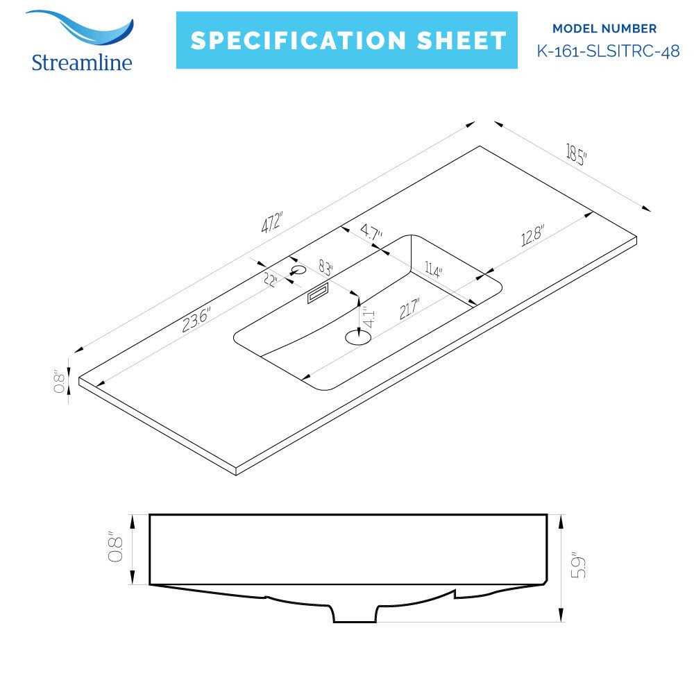 W x 18.5 in. D and is super easy to maintain and clean. Thanks to its high-quality solid surface resin material, this modern styled vanity top has you covered from makeup, hair dye stains, and even burns from hair straighteners. Additionally, this 47.2″ Solid Surface Resin Streamline K-161-SLSITRC-48 Vanity Top has an overflow protection in place, so you don’t have to worry about water overflowing from your basin. This is a great choice if you are wishing for a one-of-a-kind vanity top that does not yet come short on quality. Without a doubt, the 47.2″ Solid Surface Resin Streamline K-161-SLSITRC-48 Vanity Top will add a welcoming glow to your bathroom.