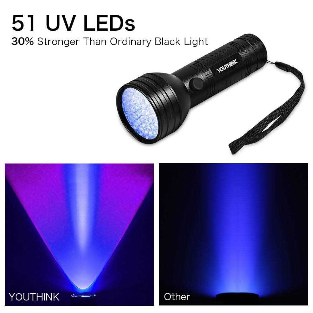 Style:51 LEDWhy you need the UV flashlight? Have to clean the entire carpet because of the hidden pet urine? Can’t locate the spot even you pick up familiar pet stain smell? Scorpions begin to have a party in your backyard? There are caterpillars eating your tomato plants? That is what YOUTHINK black light led flashlight just do to solve your problems!! What makes YOUTHINK black light uv flashlight special? * Large Coverage – More powerful 51 UV LEDs, larger area clear without losing the intensity of the UV light, emits powerful long wave ultraviolet rays, let everything no longer hidden in your eyes. * More functionality – Scorpion hunting, find pet urine on rug/floor, leak diagnostics, shine rock specimens, dry UV glue, gel nail fix, light up disc golf, authenticate currency, Official Identification cards, passports. *Maximum durability – The outer covering uses the high quality aluminum material extrusion formation, surface after frosting oxidized. Solid and lightweight, more user friendly.Specifications:- Bulb Type: LED 395nm- Bulb Life: 100,000 hrs- Body Material: aluminum- Battery Require: 3 x AA batteries (not included)- Switch Type: push On/Off button- Weight: 6.5 oz. 185g- Head Diameter: 2.2″- Body Diameter: 1.4″- Length: 5.9″Package included:1 x Handheld UV light