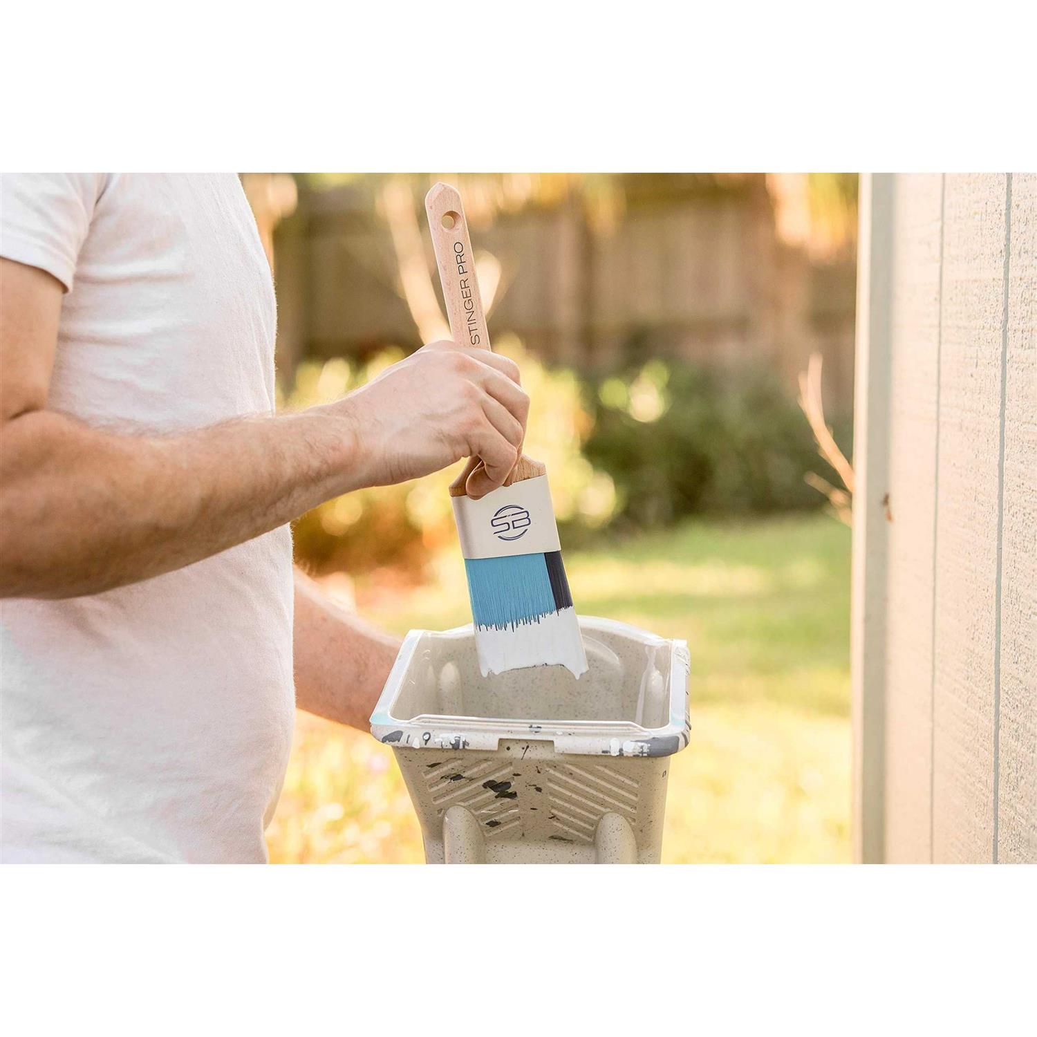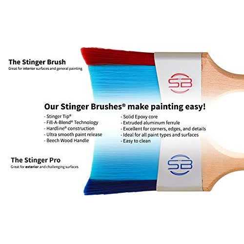 Complete painting jobs with ease and precision using this set of Angle Paint Brushes by Stinger. Designed with Fill-A-Blend technology, they feature filaments of differing lengths for better coverage and for precision application along edges and corners. These filaments also make the Stinger paint brush set quick and easy to clean. Hardline construction offers long-lasting, professional-grade durability. An epoxy core surrounded by a rust-resistant extruded aluminum ferrule holds bristles in place. Each 2.5 inch paint brush is suitable for working with any type of paint or stain so you can cover furniture as well as the walls of rooms in a fresh coat. Included in this set is a Stinger Pro brush for interior jobs, featuring PBT filaments that hold more paint. The Stinger paint brush is well-suited to exterior work on smooth surfaces. Both brushes have smooth handles made of sturdy beech wood with a convenient hanging hole for space-saving storage.