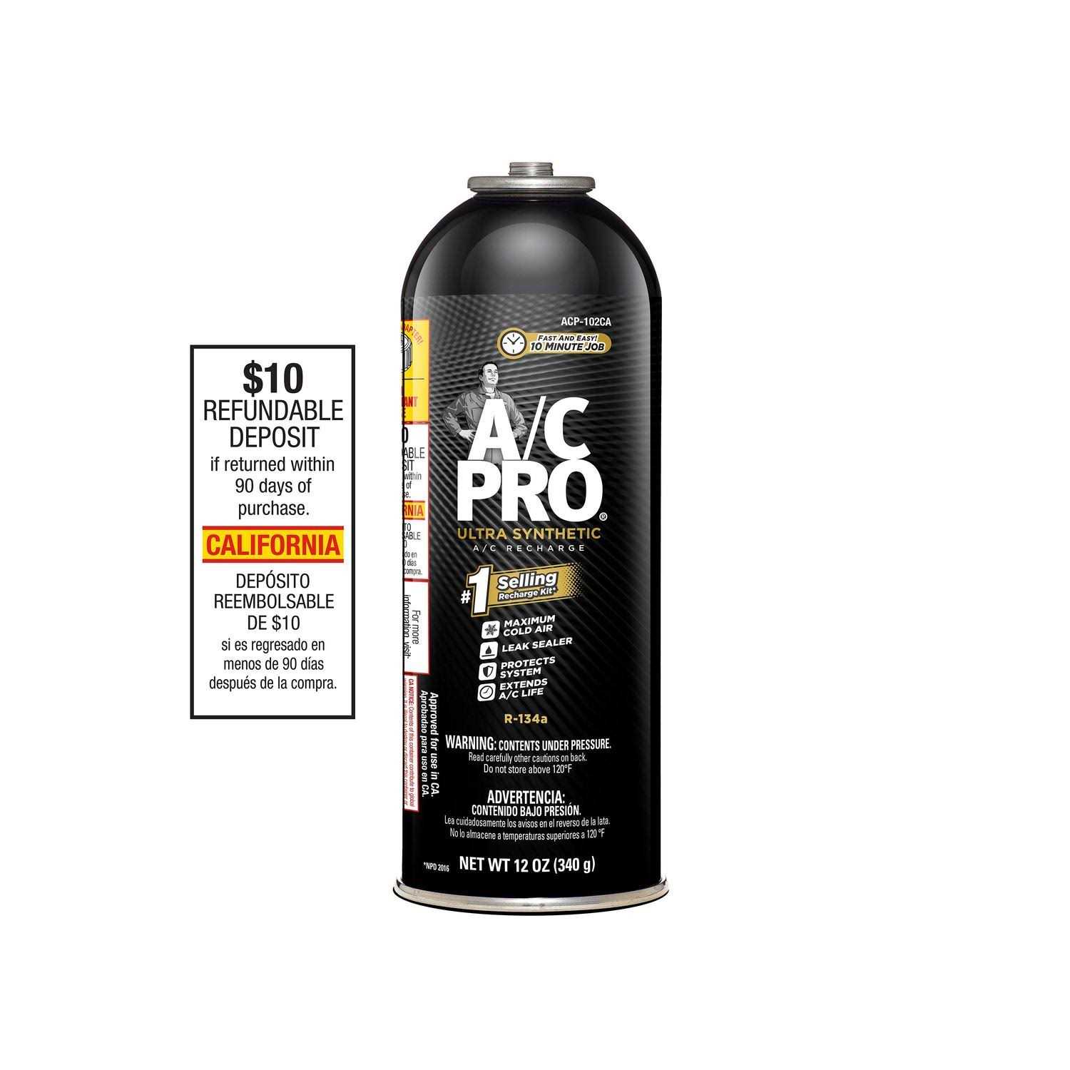 Fill your cars A/C system with A/C Pro refrigerant and youll notice the difference when the patented formula with 2X cooling booster keeps you comfortable and your A/C humming. This 12 oz (340 gram) refill can is the perfect size for topping up an A/C system before a long drive, or keeping with you in case of emergencies. The integrated leak sealer can easily solve small leak issues in O-rings, hoses, and gaskets, extending the lifespan of your A/C system.