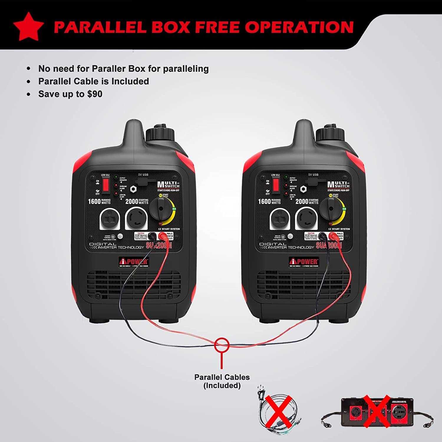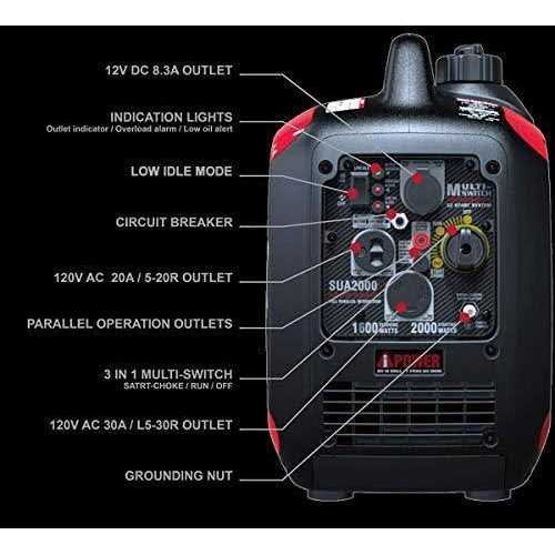 The A-power SUA2000i provides clean quiet 2 000 watts of starting power and 1 600 watts of running power. Powered by 79cc A-power engine the generator is ideal for outdoor events such as concerts camping trips tailgating parties racetracks RVs and many other applications. At only 46 lbs. you can take portable power wherever you go. At 58 dB you are assured quiet operation. With Inverter technology you are using clean power meaning its safe for electronics such as televisions tablets laptops and other power sensitive equipment. The inverter module converts the raw power from DC to AC output. The engine speed varies depending on electrical demand which also significantly reduces noise. The SUA2000i also has parallel capability. With two parallel cables two generators can link for nearly double the power. You dont need any extra external parallel kits any more. It does bring you added convenience while reducing your cost. The generator also features a multi-switch to integrate the start run and stop functions. This switch operates fuel on/off choke on/off engine on/off which provides convenient and easy operation. A built-in fuel gauge on the fuel tank helps remind you when you need to refuel. Equipped with a DC adapter plug you can conveniently charge your battery or cell phone with a USB adapter.