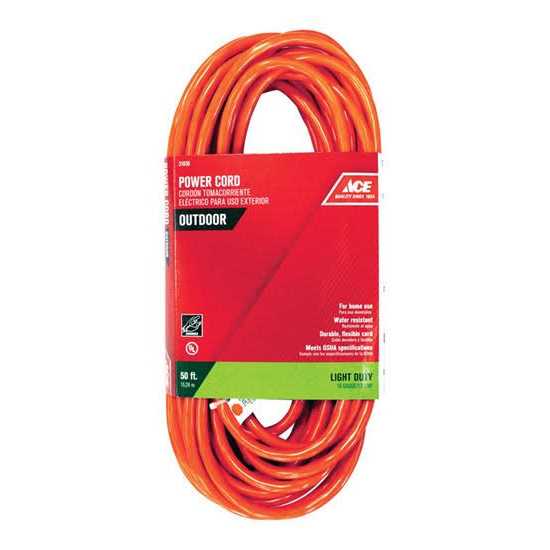 Brand Name: Ace Indoor or Outdoor Cord Length: 50 ft. Color: Orange Product Type: Extension Cord Gauge Conductors: 16/3 SJTW Maximum Amperage: 13 amps Packaging Type: Sleeve Plug Type: Grounded Wire Type: Round UL Listed: Yes Insulation Material: PVC OSHA Listed: Yes Number of Outlets: 1 outlets Watts: 1625 W Volts: 125 V 5-15R plug type Water and oil resistant