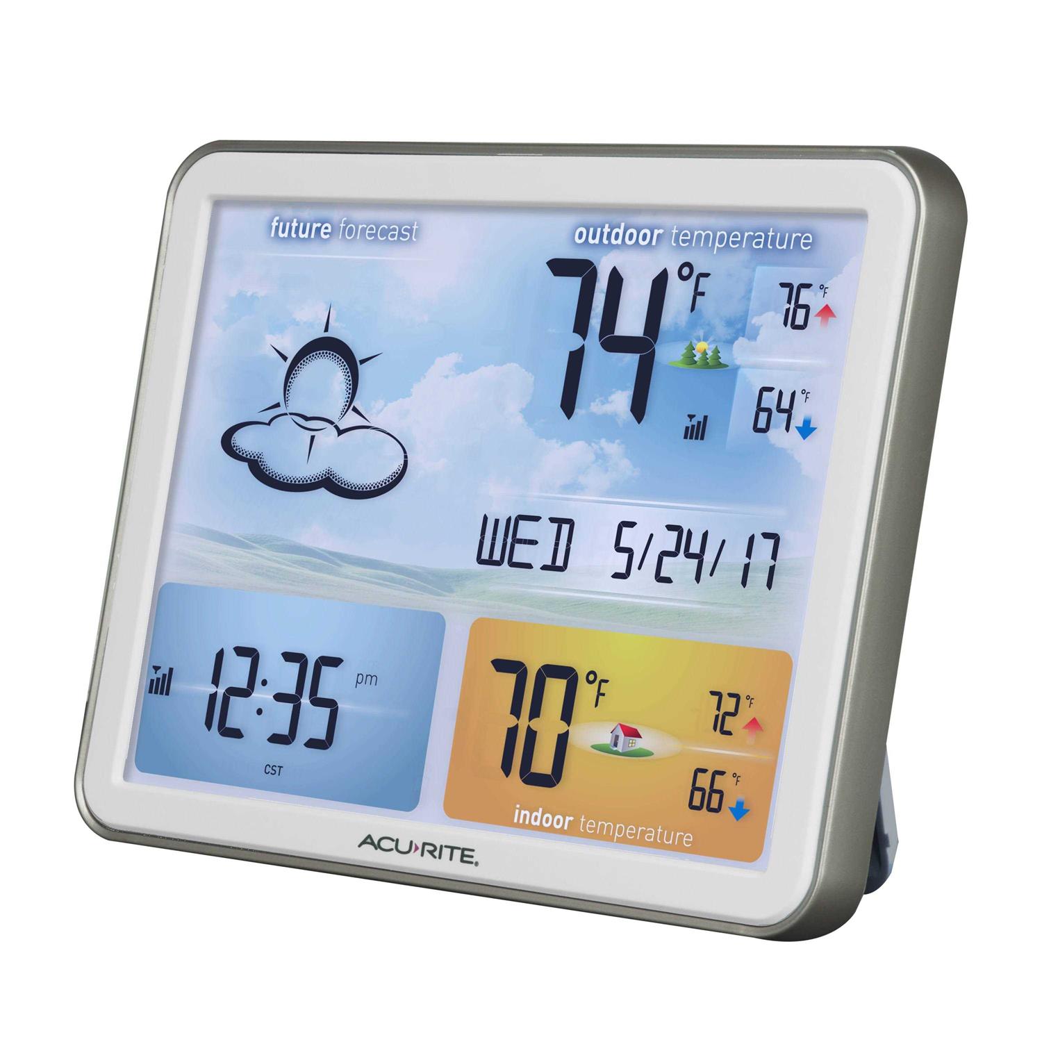 The AcuRite 02081M Digital Color Weather Station with JUMBO display uses patented Self-Calibrating Technology to provide your personal forecast of 12 to 24 hour weather conditions. Self-Calibrating Forecasting is generated from weather data measured by the outdoor sensor. The bold, easy to read extra-large color LCD screen includes indoor/outdoor temperatures, along with daily high/low readings. You never have to worry about if the time is right with a self-setting atomic clock and calendar. The clock automatically adjusts for Daylight Saving Time. The color display stands upright for tabletop use or is wall-mountable. The outdoor sensor features powerful wireless technology, a weather-resistant design and an integrated hanger for easy mounting.