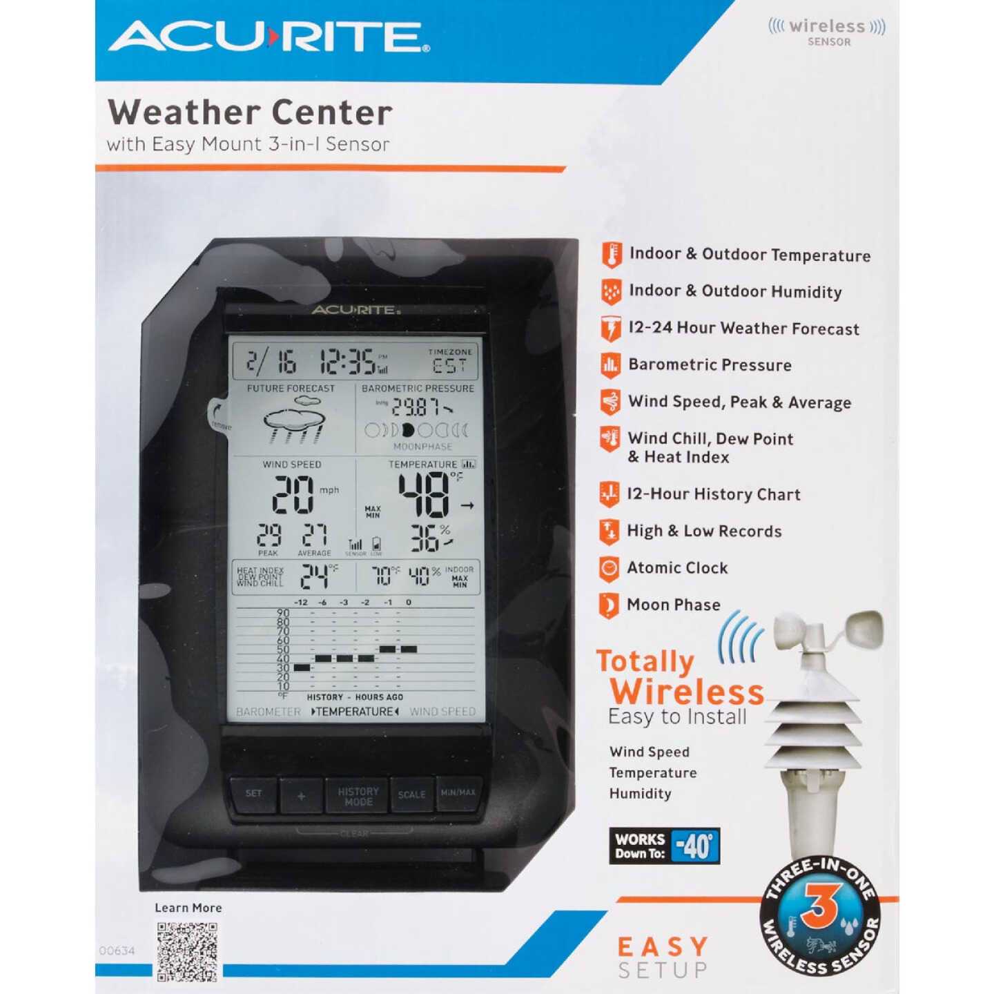 It features a 3-in-1 wireless sensor that records temperature, humidity and wind speed. The indoor display then displays the indoor or outdoor temperature in Celsius or Fahrenheit, dew point, wind chill, heat index, indoor or outdoor relative humidity, future forecast, bar graph history, wind speed, atomic clock and moon phase. The future forecast icon displays 14 different weather conditions using a patented self-calibrating algorithm. Dimensions: 8″ H x 5.4″ W x 1.9″ D.