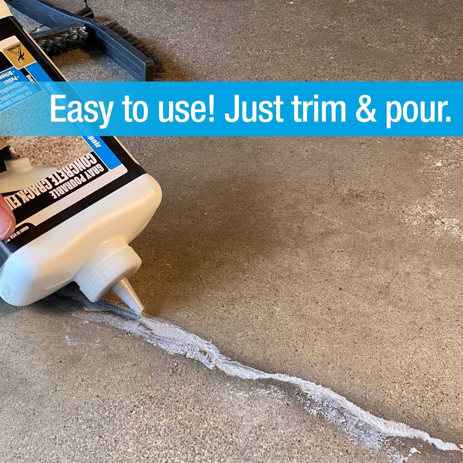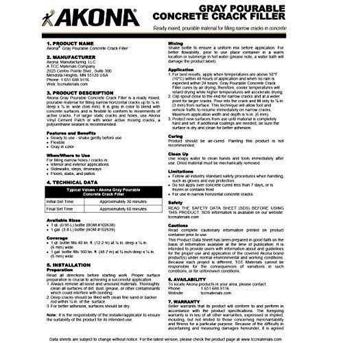 Akona Gray Pourable Concrete Crack Filler is a ready-mixed, easy-to-apply, pourable material for filling cracks up to ” deep x ” wide. Gray in color to blend with concrete surfaces and flexible to conform to movements of active cracks, Concrete Crack Filler is ideal for horizontal concrete surface such as driveways, sidewalks, patios and garage floors. Available in 1 gal. bottles and 1 qt. bottles. For larger cracks and holes, use Akona Vinyl Cement Patch. Product should not be allowed to freeze.