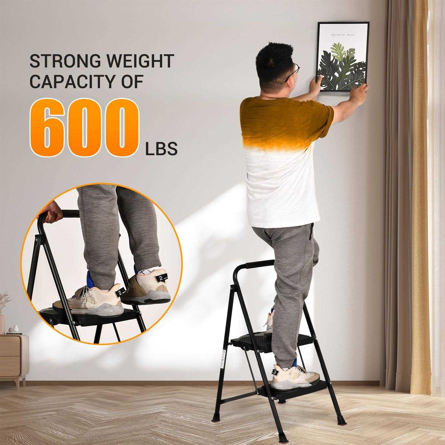 Strong Weight Capacity of 600LBS:This 2 step ladder has passed the load-bearing test of 600LBS , So,our step stool is friendly for robust body shape. The groove design on the pedal, when using the foldable step ladder, will buckle the reinforcement bar behind the ladder, so it can be made sure that it it stable of your every step. 13.39inches Really Widened & Non-slip Pedals:The step ladder with handrails steps of ALPURLAD is 5.51 inches wider than others on the market,true meaning of extra wide pedals.The two step ladder pedal is more wider ,the force area will be more larger and more sturdy . Moreover,with the dense anti-skid texture design,when your feet on the foot, you will feel comfortable,stable and safe. Special Custom Rubber Feet, Stable & Safer:This step ladder for home is ALPURLAD’s high-end home ladder series, the detail has been contrasted and designed. This Folding step stools for adults foot cover is made of thicker wear-resistant foot cover, the force is more uniform and more stable. The adults don’t slide when using the ladder, and it can also prevent scratching the floor. Folding Ladder, Easy to Carry and Storage:The stair stepper has a one-step opening and folding design, which means it can be easily retracted and opened without assembly. The folded size of the stepping stool is only 20.47*2.76*37.99inches, it will not take up much storage space and can be placed in any corner of the house. The weight of the step stool folding is 4KGS, even a lady can easily pick up the folding step stool to carry. Multi-used Ladders for Home Improvement:After the step ladder 2 step folding is unfolded, the distance from the top pedal to the ground is 34.65inches. stepladder is widely used in different indoor and outdoor spaces such as balconies, kitchens, bathrooms, living rooms, bedrooms, libraries, etc. ALPURLAD the folding ladder brings a full sense of security every time you climb up and take things. ALPURLAD high-end home step ladder is here! ! ! Five highlights that are sure to make you feel value for money. /b br br 1. Real widened pedals, more stable and comfortable climbing br 2. Pass the 800LBS load bearing test, So,our step ladder is friendly for robust body shape br 3. Customized widened and wear-resistant foot cover, Stable & Safer br 4. Lengthen the cotton handrail to keep you warm in the cold winter br 5. One piece opening and shrinking design, easy to use without occupying space br br WHY CHOOSE ALPURLAD 2 STEP FOLDING STEP LADDER AMONG MANY CHOICES /b br br br When you worry about dressing up for Christmas, Halloween, Father’s Day, Mother’s Day or Birthday, our step stool can always help you by hanging ribbons on the wall and hanging gifts on the Christmas tree. br When you are worried about cleaning the room, it can also help you reach the height you want. You can clean the cabinet, the refrigerator or whatever you want to clean. br In this way, you no longer have to rely on your husband, children or neighbors, and you can become a SUPER WOMAN!