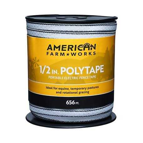 Polytape Electric Fencing is ideal for equine fencing since it is more visible than traditional wire. The electric fence tape contains 5 strands of electrical conductors and has a breaking load of 150 lb. For convenience, it’s easier to install, repair and splice than regular wiring. This roll contains 1/2 in. x 200 m of white American FarmWorks polytape. White polytape is ideal for equine fencing, as it is highly visible to horses and other animals Spool contains 656 ft. (200 m) of American FarmWorks polytape electric fencing Woven with 5 strands of electrical conductors Breaking load: 150 lb. Lightweight weave makes it easy to install, repair and splice Durable poly fencing will not rust for a long-lasting solution Please note: You may also need to use polytape insulators and a polytape fence charger connector to complete your project.