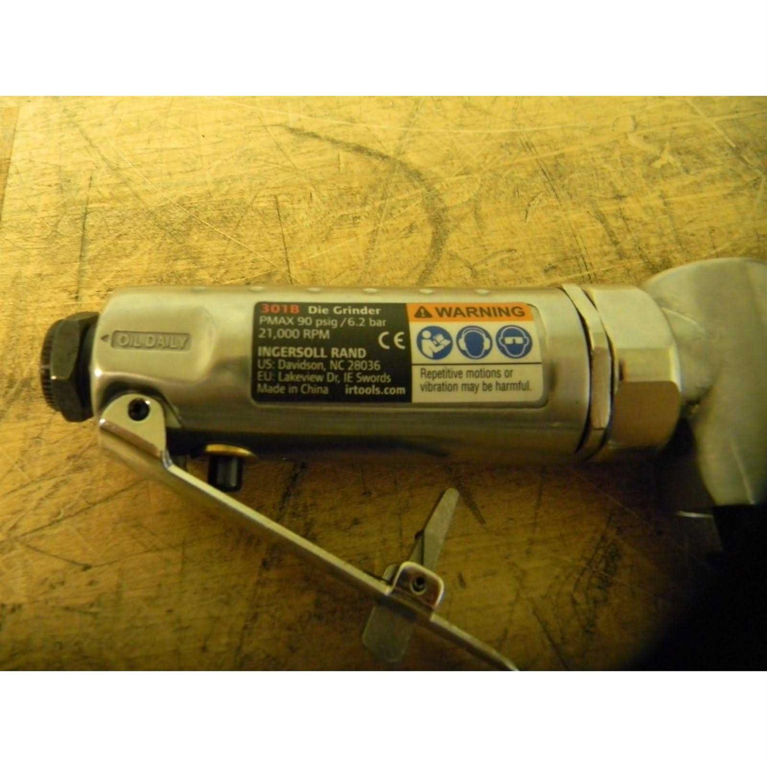 Ingersoll-Rand 301B Air Angle Die Grinder Long-lasting, economical, and ideal for general-purpose grinding, the 301B delivers a number of beneficial features in one compact package. Right-angle configuration provides easy access to tight spots, so you can grind, break sharp edges, de-burr, port, and polish virtually anywhere! Durable ball-bearing construction improves balance, reduces vibration, and ensures a longer life. Strong aluminum housing withstands tough operating conditions. Small and lightweight design provides easy operation greater access to tight spots. Easy-to-use, integral safety-lock throttle lever prevents accidental start up. Front exhaust helps keep work surface clean Tool comes with 1/4″ and 6 mm collets and two wrenches.