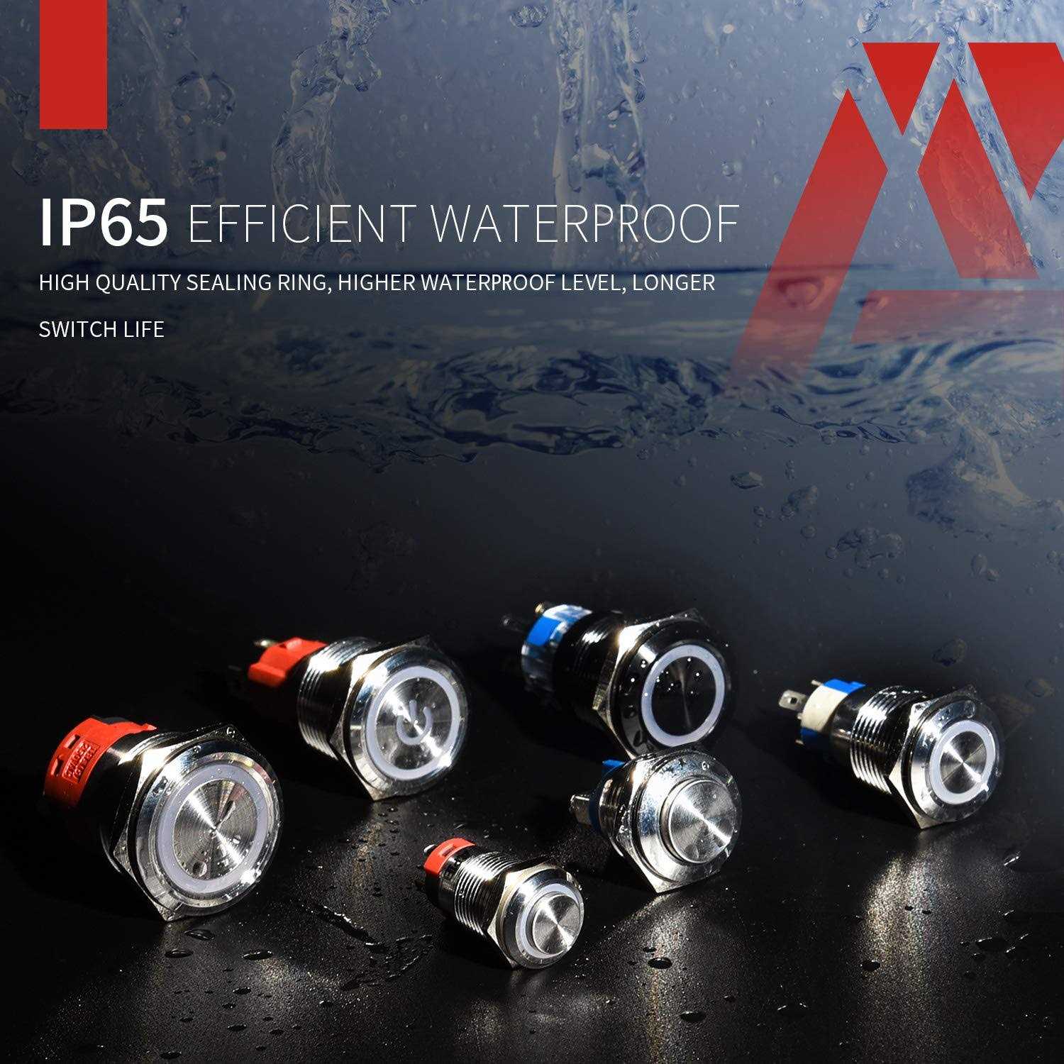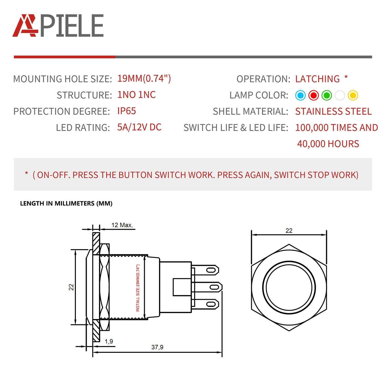 Specification: Mounting Cut Hole: 19mm ( 0.74) Operation: Latching Structure: 1NO 1NC Switch rating: 5A,12V AC/DC LED Pattern: Ring Indicator Contact Material: Silver alloy Protection Degree: IP65 100,000 Times Electric Work Life. APIELE Stainless Steel Push Button Switch This All Metal Switch Functions Manually As A Replacement Of Auto Refit, Boat Refit, Instruments Apparatus, Enter Guard, Household Appliance. It Provides Solid And Crisp Push Feedback And Comfortable Led Light. Ip65 Waterproof Make It Can Be Used In Humid Environment. Metal shell tolerates vibration and other harsh environmental conditions. The Improved Wire Diagram Come With The Switch And A Non-Electrical Person Can Install It Easy. Get A New One If Broken In 3 Years. Package Include: APIELE Push Button Switch Pigtail Connectors Quick Installation Wire Diagram What is a Latching switch The Latching switch will remain on once it is pressed and stay on until it is pressed again. Auto Refit Use this switch to replace the light switch, horn switch or other control switches in the cars/ boats/ trucks. Bright and comfortable Led and metal appearance make the switch very cool. Door Bell/ Entrance Guard Push Button It can use as a door bell, entrance guard push button switch in the outdoors. As it is IP65, it can work relatively harsh environment. Household Applicances Control It is also a good choice to use it as a replacement switch of household Appliances. Such as table lamp switch, PC switch, Audio switch. IP65 Waterproof As it is full metal appearance and with a rubber ring, the switch achieves IP65 waterproof degree. It can used in wet environment, such as boat control panel, kitchen, outdoors etc. Note that this switch can be used under water. Long Work Life. The metal shell and push part is not easy to damage.The Mechanical work Life is 500,000 timesThe switch use Silver Alloy contact to make the Electrical Work Life more than 100,000 times. Pure Led Lights APIELE Switch use pole-less lamp beads, bright and dazzling brightness, long service life. The work life of the led light is more than 40,000 hours.