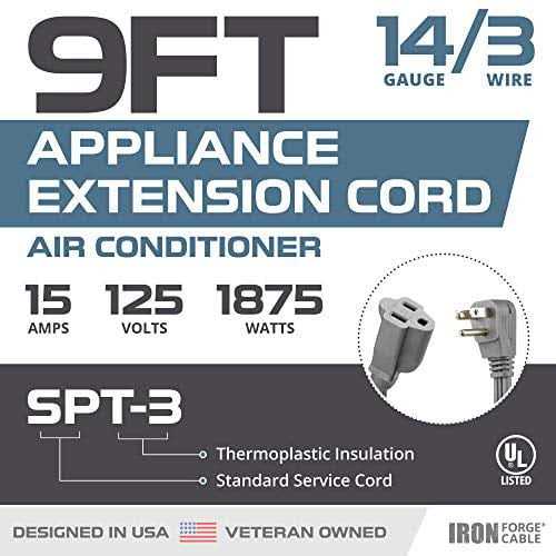 Perfect for Major Appliances This heavy duty 14 gauge extension cord is perfect for powering air conditioners and other major home appliances including washers, dryers, refrigerators, power tools, and more! Heavy Duty Vinyl Insulation Heavy duty vinyl insulation protects the appliance cord against moisture, abrasion and sunlight. The grey cable blends into your homes decor. Space Saving Design The right angle plug stays flat against the wall, making this appliance extension cord ideal for tight spaces. UL Listed, Veteran Owned 3 wire grounded, 14 gauge, 9 foot, 15 amp, 125 volt, 1875 watt, SPT-3
