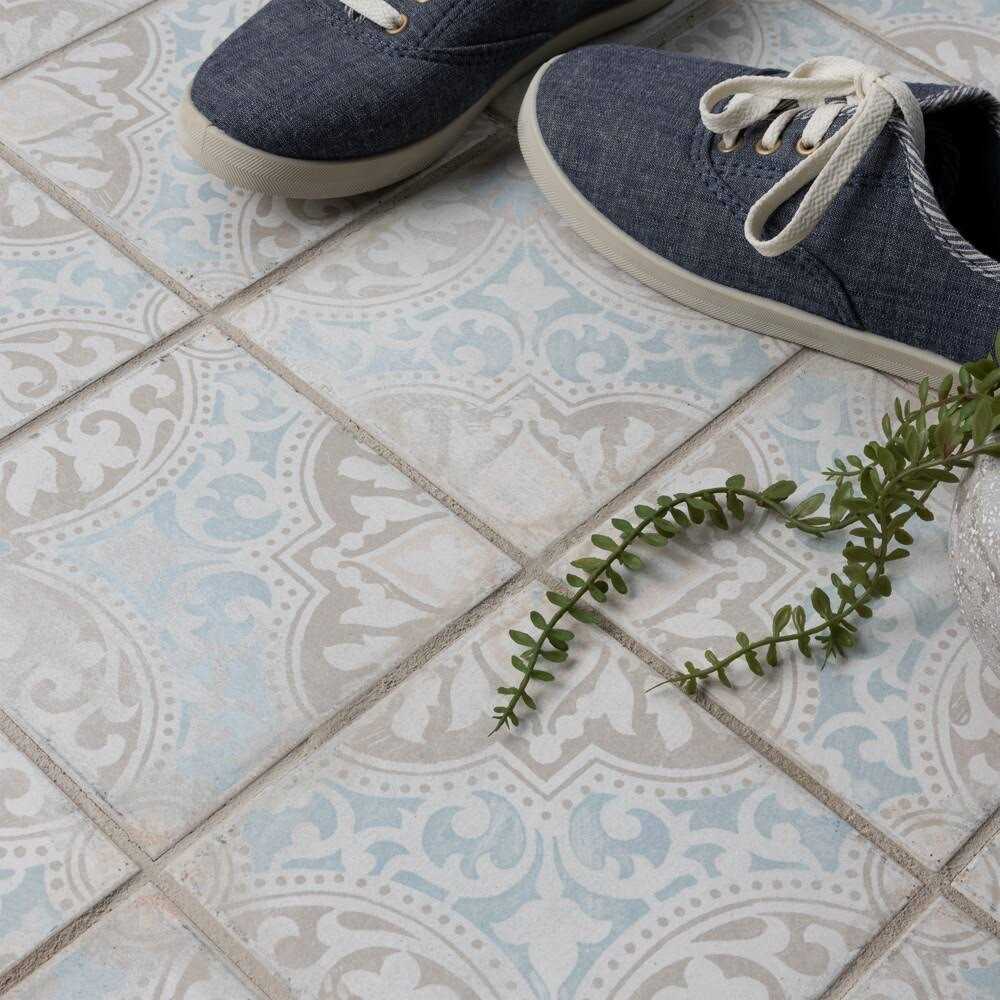 Modern and vintage design elements blend together to create our Barcelona Decor Montjuic 5-3/4 in. x 5-3/4 in. Featuring a worn cement appearance, this tile is a subtle statement piece created by floral motifs in faded pastel shades of light blue, beige and brown set on a textured antique white base glaze. With a delicate color palette and realistic imitations of scuffs and spots, this encaustic inspired tile evokes a loved, worn and century-old appearance with a chic modern edge. Available in six print variations that are randomly scattered throughout each case, the variation throughout each tile mimics an authentic aged appearance. Its impervious, frost-resistant and durable features make this tile and ideal choice for both indoor and outdoor commercial and residential installations including, backsplashes, kitchens, bathrooms, showers, entryways and patios. This tile is a perfect choice on its own or paired with other products in the Barcelona Collection. Tile is the better choice for your space. This tile is made from natural ingredients, making it a healthy choice as it is free from allergens, VOCs, formaldehyde and PVC. 10.77 square feet, 44 pieces per case. Case weight is 37.25 lbs. Grade 1, first-quality porcelain tile for floor and wall use. Glazed, medium textured finish with a low sheen and moderate variation in tone P.E.I. Rating IV has high resistance to abrasion and is suitable for heavy-duty residential and commercial kitchens, hotels, exhibition and sales rooms with some dirt conditions Impervious tiles have a water absorption of less than 0.5% for indoor and outdoor use and is frost resistant C.O.F. greater than .60 to .79 is required for commercial applications to meet or exceed ADA (Americans with Disabilities Act) Guidelines. Skid resistant.