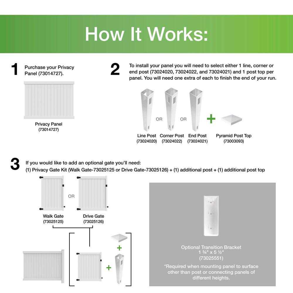 - 4-ft gate coordinates with Freedom 6×8 Bolton (model # 73014727) and Freedom 6×6 Hampton (model # 73014393) vinyl fence panels