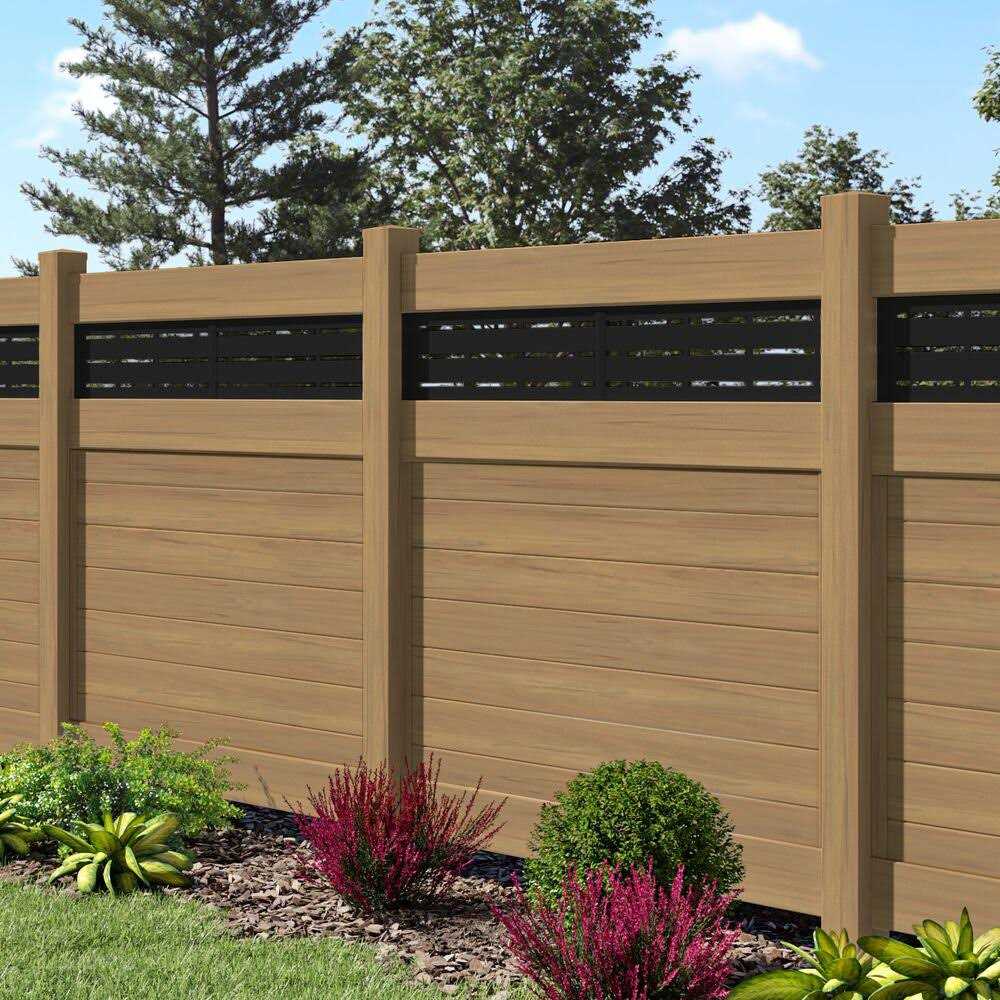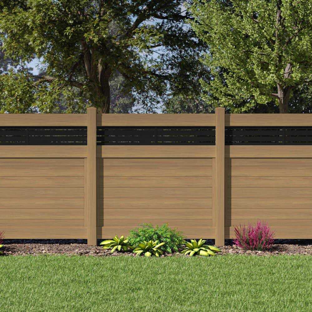 Horizonal Privacy Vinyl Fencing with Decorative Screen Panel Top features contemporary, horizontal infill boards on the bottom section for privacy and Decorative Screen Panels with Boardwalk pattern on the top, for a unique and design-forward product. Infill boards are held securely in place by heavy-duty structural post channels, which also allow for easy slide-in installation. Available in a variety of colors and 2 widths, Horizontal Privacy Vinyl Fencing with Decorative Screen Panel Top also provides a safe enclosure around pools. Color: Woodgrain Cedar.