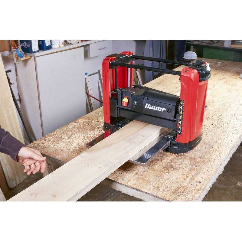 The Bauer 15 amp thickness planer has heavy duty power to quickly smooth fine grade hardwoods without nicks or sniping. The rock solid four column frame prevents chatter and torsion for satin smooth finishes. The planer has a smooth auto-feed feature for nick-free planing. Integrated safety switch prevents accidental startups. High precision gear and pinion lift system for easier, more reliable adjustment. Bauer 15 Amp 12-1/2 in.