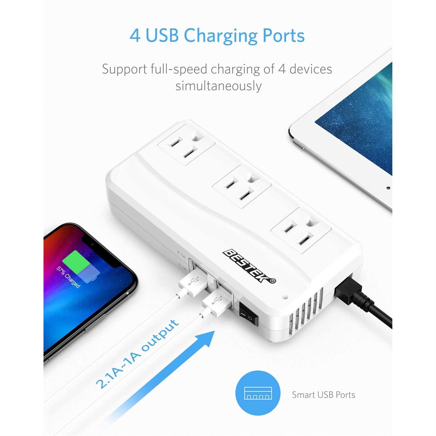 BESTEK Advantage America’s leading power inverter brand. Provides 200 watts continuous DC to AC power and 500 watts of peak power BESTEK 200W Power Inverter BESTEK Power Inverter with 4 USB ports and 3 AC outlet only for DC 12V and Car not applied for DC 24V and airplane use. It’s normal for the inverter to become warm to the touch while you are using it avoid placing the inverter in direct sunlight or next to heat-sensitive materials. Do not use to power high power electric devices such as hair dryers electric heaters which might blow a fuse. Isolation Voltage Protection 3 AC Outlets and 4 USB ports Mufti-Protection Durable Cigarette Lighter 4 USB Charging Ports & 3 AC Outlets Ideal for powering 7 devices simultaneouslyand easily toggle your outlets off and on using the power button. Cooling Fan Built-in very silent cooling fan helps reduce heat and prevent shortages. Anti-Slip Rubber Mats There are rubber mats at the bottom four corners prevent it from slipping. Durable Cigarette Lighter Double durable springs each side for tight mount stable and electrical safety. Power On LED Strip Lights It can power on your LED Lights anywhere for Christmas and other festivals to create a great atmosphere. Car Becomes RV With our car power inverter you can use most of home appliances in your car in the open air such a watching TV playing games give you the experience like being in an RV.
