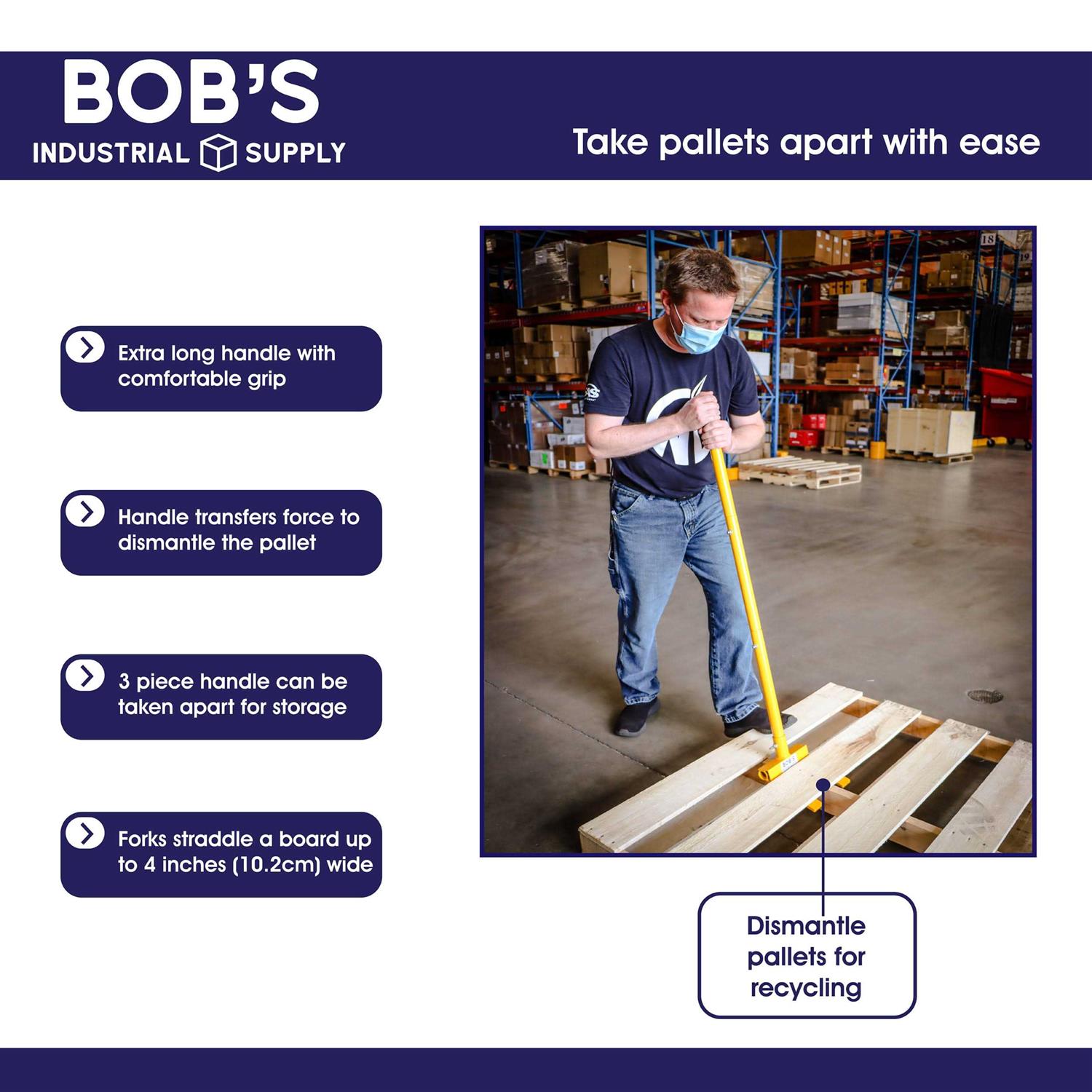 Tearing pallets apart the old-fashioned and frustrating way by hand is a tough job that results in even your best boards breaking, splintering, and splitting. Not only is it used for removing and replacing the top and bottom wood planks on pallets, but it can additionally be used as a deck board removal tool or even in repurposing wood for DIY projects. Since this pallet ripper tool comes with a 3.5-foot (1.1m) long handle and uses leverage to do the work, it is easy to use. The bright yellow color allows you to spot the steel pallet buster breaker across your workshop or warehouse and against any backdrop. Pallet not included. For busting pallets only. Not intended for pulling or lifting.