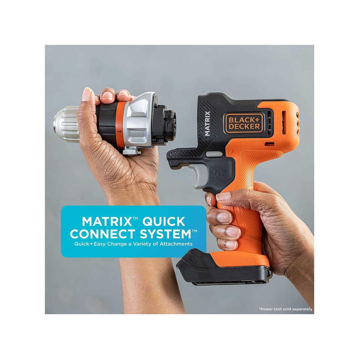 Matrix Drill/Driver is a part of the Matrix Quick Connect System. It has a powerful 20v MAX motor which provides enough power for a full range of applications attachments, and a 3/8-inch chuck. It features a lithium ion battery . Always Ready, holds a charge up to 18 months.