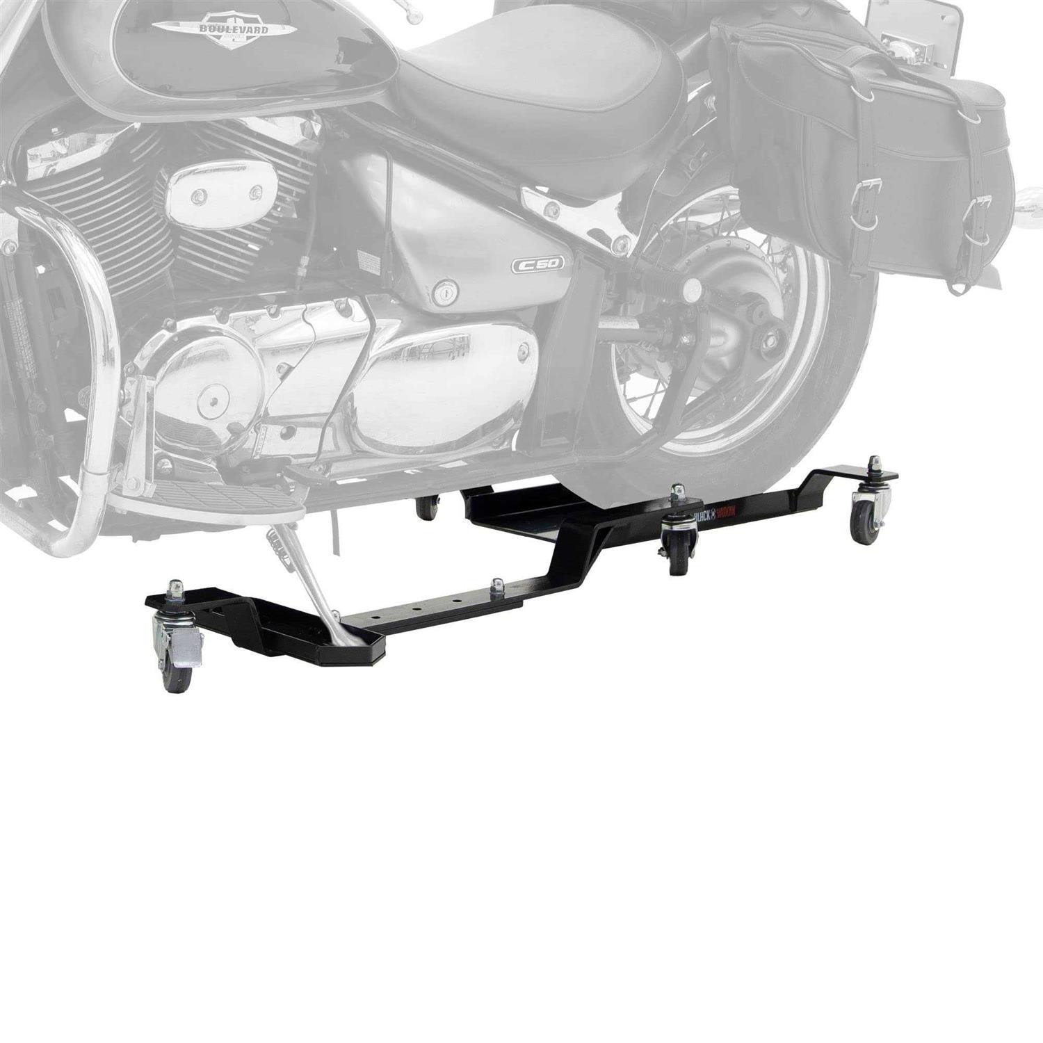 When space is tight, you work with what you’ve got. This compact motorcycle dolly keeps it streamlined to bring you what you need without the bells and whistles that take up space. With an adjustable front kickstand platform and a rear tire platform, you roll your rear tire onto the rear platform and place your kickstand on the front platform. The front tire stays on the ground. Put the bike in gear, and roll it where it needs to go. Simple as that! Four rear casters (two locking) and one front caster give you the flexibility of movement to get your bike into position for storage or maintenance.