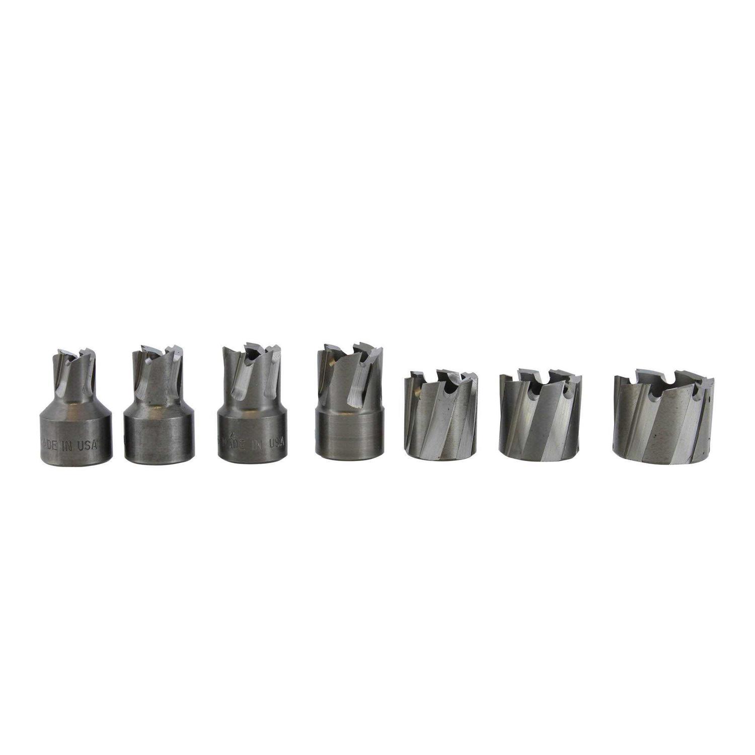 - Includes: 5/16 3/8 7/16 1/2 9/16 5/8 and 3/4 Cutters Arbor (2) Extra Pilots and Center Punch.