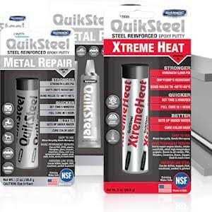 CarGo QuikSteel Epoxy Putty with stands up to 500 degrees Fahrenheit temperatures, sets in 5 minutes, is steel hard in 15 minutes and cures in one hour. Cures under water and can be drilled, tapped, filed, sanded and painted. Bonds to all metals, fiberglass, plastics, glass, wood and ceramics.