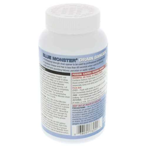 - Blue Monster Drain Banger is a hot water activated drain cleaner designed to be used by professional contractors only.