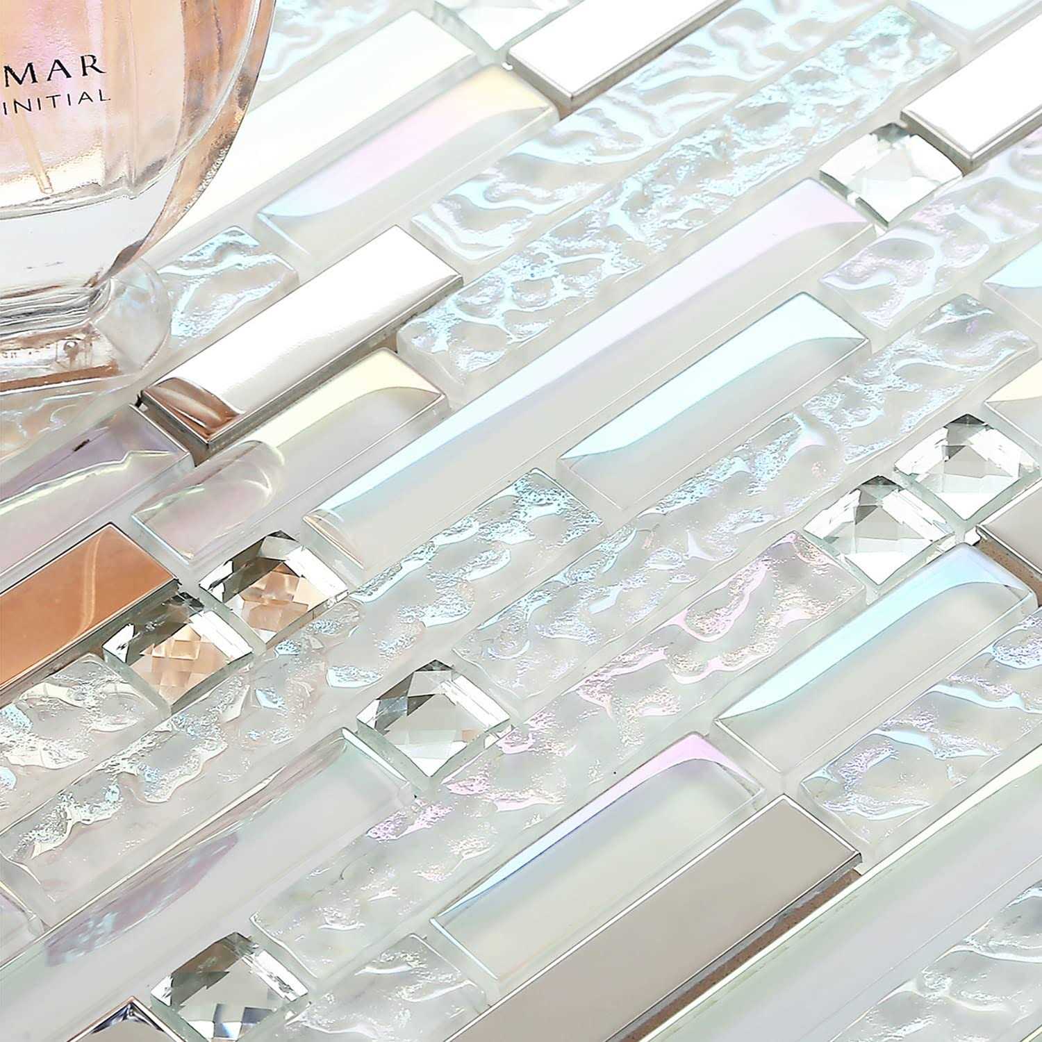 Blujellyfish Glass Metal Tile Iridescent White Glass Silver Mirror Stainless Steel Blends Interlocking Strip Wall Tiles TSTNB01 (Pack of 5 Sheets)