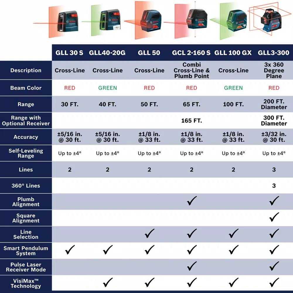 Cross-line mode 窶 Smart Pendulum System 窶 Manual mode 窶 Secure transport 窶 Ergonomic, compact and lightweight 窶 Product details The Bosch GLL 30 self-leveling cross-line laser projects two lines, making a cross-line projection, for a wide array of level and align uses. This versatility makes it more valuable than a typical line laser. With top-notch accuracy and one-switch operation, the user’s leveling and alignment tasks are done quickly and correctly. The laser lines are visible up to 30 ft. The smart pendulum system self-levels and indicates out-of-level condition to help ensure an accurate layout and it locks the lines at any angle. The pendulum system locks when switched off, to assure secure tool transport. The included MM 2 Flexible Mounting Device provides microfine height adjustment and it allows the laser to be clamped on virtually any surface from 1/2 to 2-1/4 in thick, for level lines at any height. Cross-line mode, projects two very bright lines that are ideally level. Cross-line mode, projects two very bright lines that are ideally level. MM 2 Flexible Mounting Device, clamps to multiple surfaces and provides microfine height adjustment. Smart pendulum system allows tool to self-level and indicates out-of-level condition. Secure transport, pendulum locks when switched off. Ergonomic, compact and lightweight, easy-to-use and store. Features 1/4-20 tripod thread, for use with MM 2 mount, BM 3 magnetic mounting bracket or tripod. Versatile clamp, stable grip on thin and thick surfaces from 1/2 to 2-1/4 in thick. Manual mode, locks line for use at any angle.
