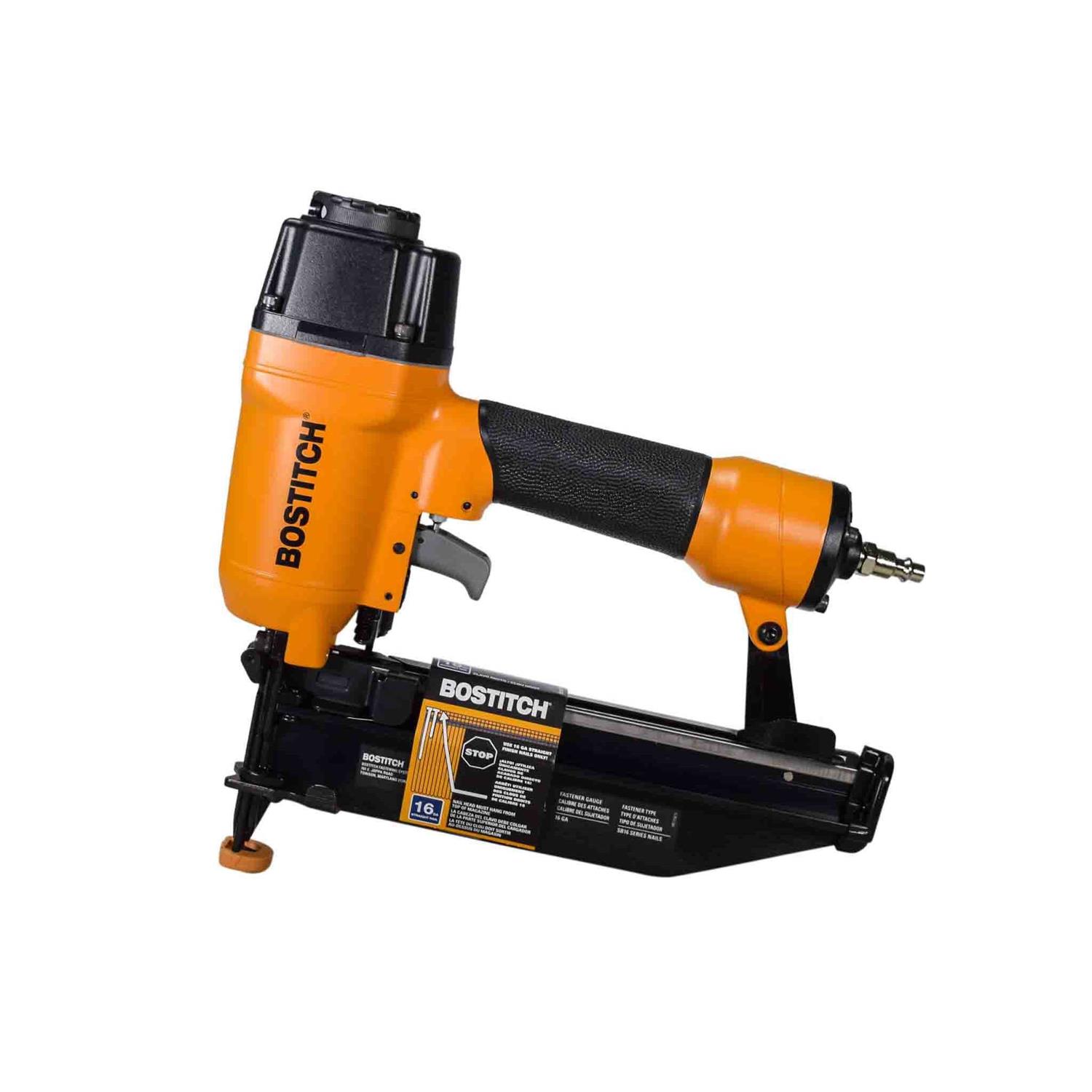 6 Gallon 150 PSI Oil-Free Compressor BTFP02012. 18-Gauge 2″; Brad Nailer SB-1850BN. 16-Gauge Straight Finish Nailer SB-1664FN. 6 Gallon 150 PSI Oil-Free Compressor BTFP02012. 150 max PSI 6 gallon tank and 2.6 SCFM delivered at 90 PSI enables long tool run-time with quick recovery. Oil-Free maintenance for long life and convenient use. Bostitch high efficiency motor for easy start-ups in cold weather or extension cord application. 80 dBA operational noise level for a quiet work environment. 29 lbs. weight and narrow 16 in. tank diameter make this unit easy to transport and store. Bostitch high flow regulator and couplers maximize air tool performance. 18-Gauge 2 in. Brad Nailer SB-1850BN. Adjustable depth guide sets nails to desired depths quickly and conveniently. Tool-free adjustable exhaust conveniently directs exhaust away from the user. No-mar tip protects work surface. Fastener range is 5/8″ – 2″ 18-Gauge Brads. 70 – 100 PSI operating pressure. 1/4″ NPT thread fitting type. 16-Gauge Straight Finish Nailer SB-1664FN. Quick release nose door for fast jam clearing.