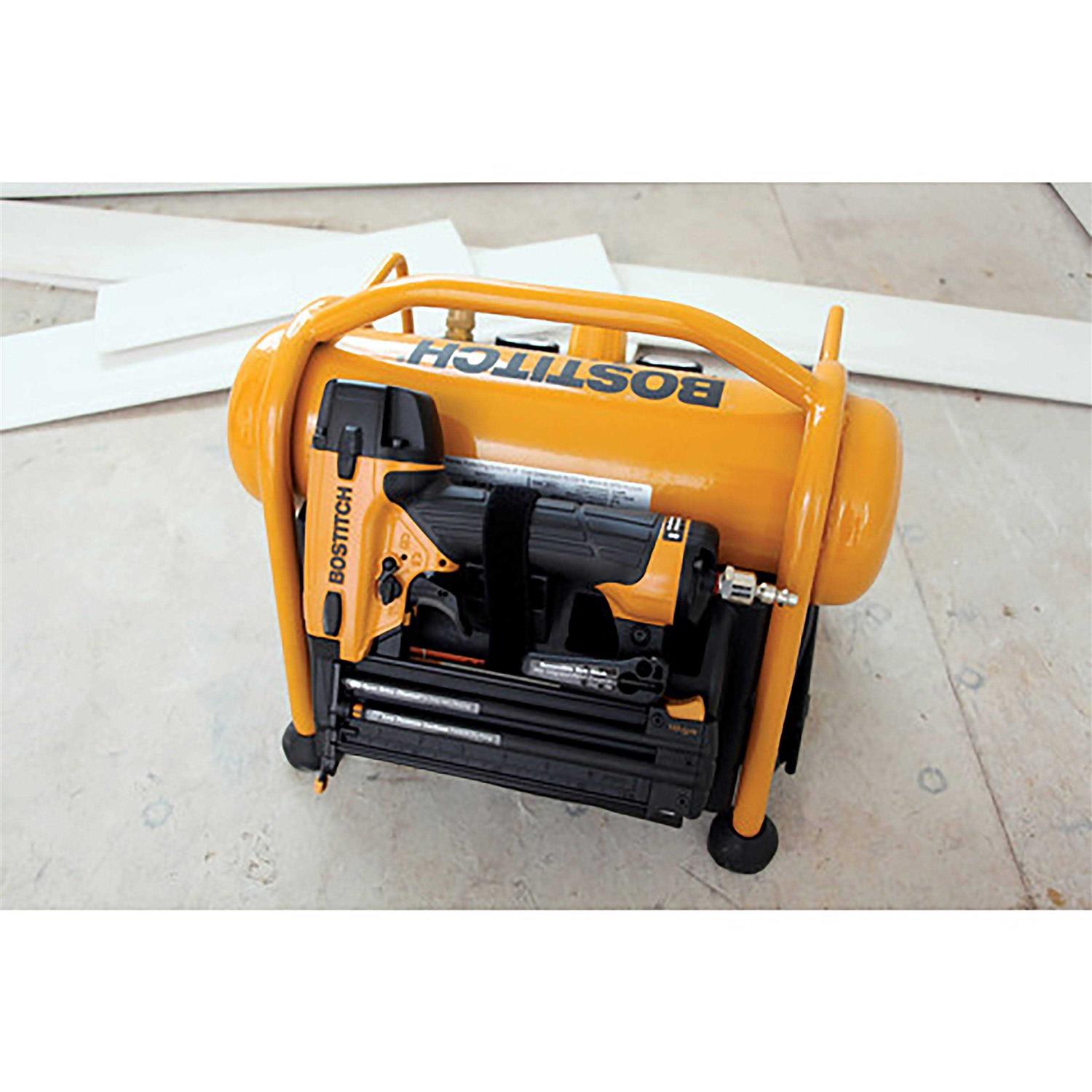 The Bostitch CAP1512-OF 1.2 Gal Oil-Free High-Output Trim Compressor has a high-output oil-free pump that delivers 2.8 CFM @ 90 PSI and 150 PSI max operating pressure for multiple finish tool operations. The 2.0 HP (Peak), 1.5 HP (Running) motor draws 12 amps for easy start up without tripping circuit breakers. The 1.2 Gal compact design only weighs 23.5 lbs. for easy portability to and from a jobsite. It has an integrated control panel with roll cage that protects gauges from jobsite damage. The LED ON/OFF switch lets you know when the compressor is on to eliminate low-pressure misfires. It has on-board tool and hose storage and a convenient storage pocket for hand tools, fasteners and fittings. The integrated cord wrap improves portability. It also has integrated no-marring rubber feet.