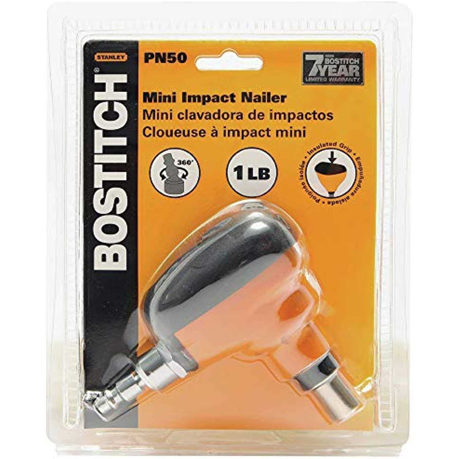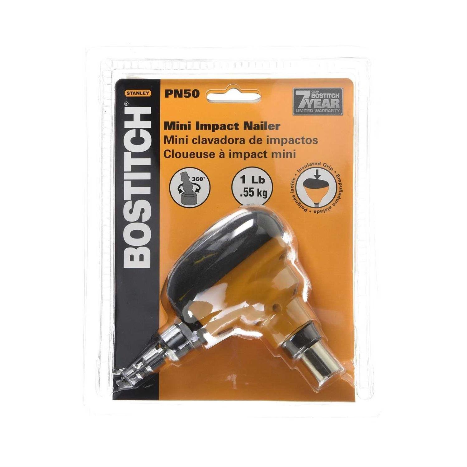 The Bostitch PN50 Mini Impact Nailer has a rubber grip designed to insulate and reduce vibration. Lightweight at only 1 lb. It has a 360 swivel air fitting for maximum accessibility in tight spots. The front exhaust directs air away from users palm. Drives most common bulk finish, framing & timber nails. Ideal in applications such as; joist hangers, metal connectors, and driving nails into confined areas. Rubber grip designed to insulate and reduce vibration; Weighs only 1 lb. 360 swivel air fitting for maximum accessibility; Front exhaust directs air away from users palm; Drives most common bulk finish framing & timber nails.