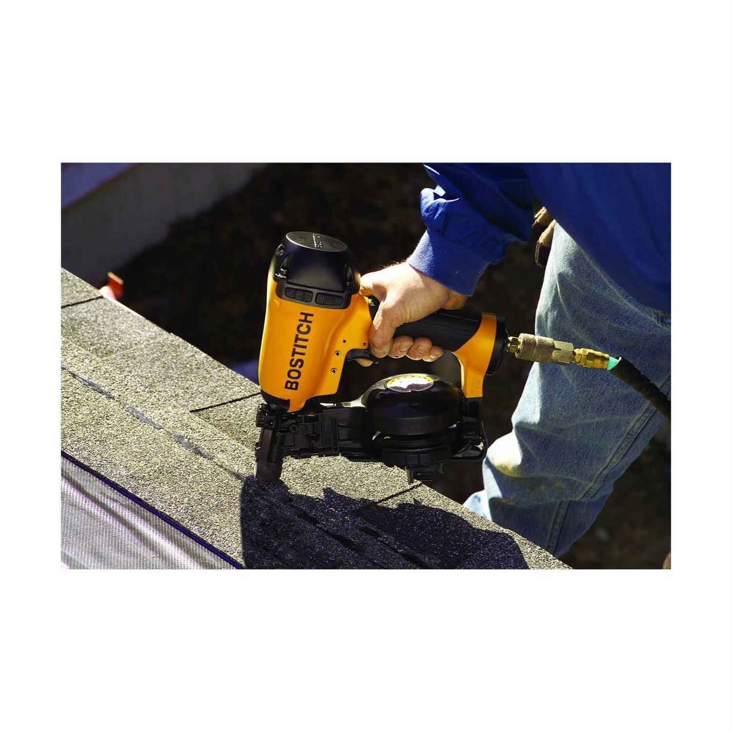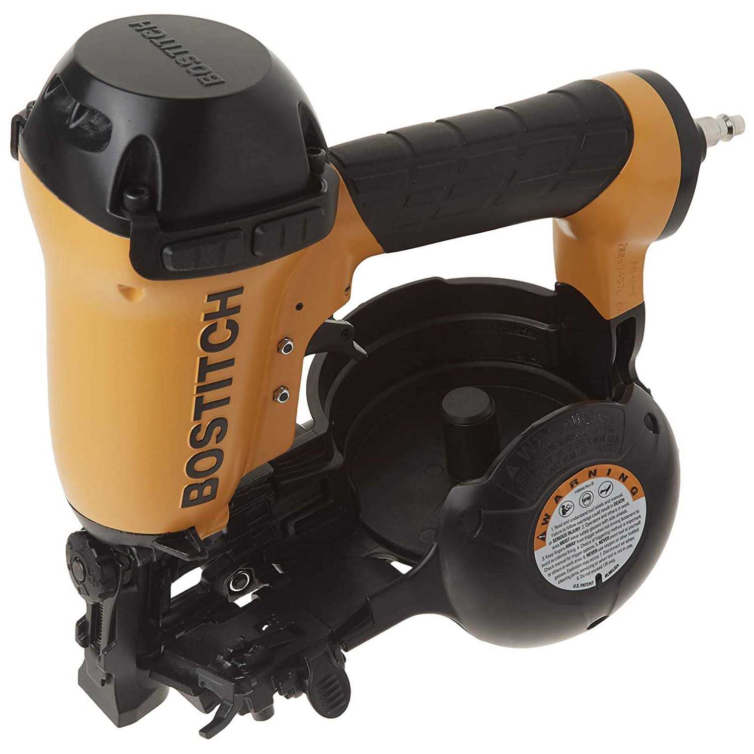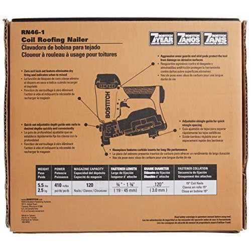 The Bostitch RN46-1 Coil Roofing Nailer is an ideal tool for roofing exterior drywall insulation board and fiber cement applications. With a patented side-loading canister zero nail lock-out easy depth of drive adjustments and aggressive performance the RN46-1 is a must-have tool for professional construction workers builders roofers and anyone looking for long-lasting performance from a coil nailer. 3/4″ to 1-34″ coil roofing nailer with lockout mechanism prevents firing when empty Adjustable depth control full round driver body and magazine wear guards side-load canister. Durable yet lightweight magnesium housing and carbide tips for long life. Patented single-action side load canister for fast one-step nail loading.