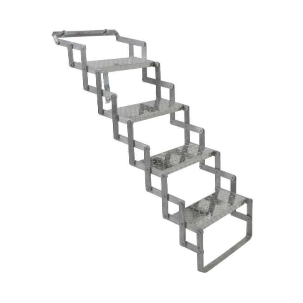 Brophy’s Aluminum Scissor Steps are lightweight stairs manufactured from heavy-gauge aluminum for maximum strength and durability. Designed for campers with holding tanks. There is an optional hand rail available for 3 4 and 5 step models. They come fully assembled and self-adjust to the terrain and fold for easy storage. Features a step size of 6 in. by 18 in. Mounting bracket is included. Note Vertical height is the measurement from level ground to the mounting bracket.