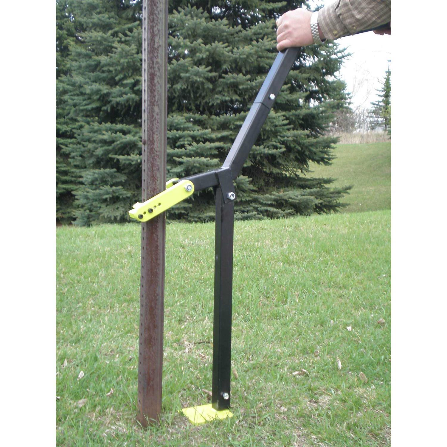 Adjustable jaws work on construction stakes U-shaped sign posts and T-posts both studded and non-studded. 3 L angled handle provides the leverage you need. Pulling system shortens to reach stakes and posts closer to the ground. Handles posts from 3/8 to 2 dia. Sturdy 5 x 4-5/8 platform.