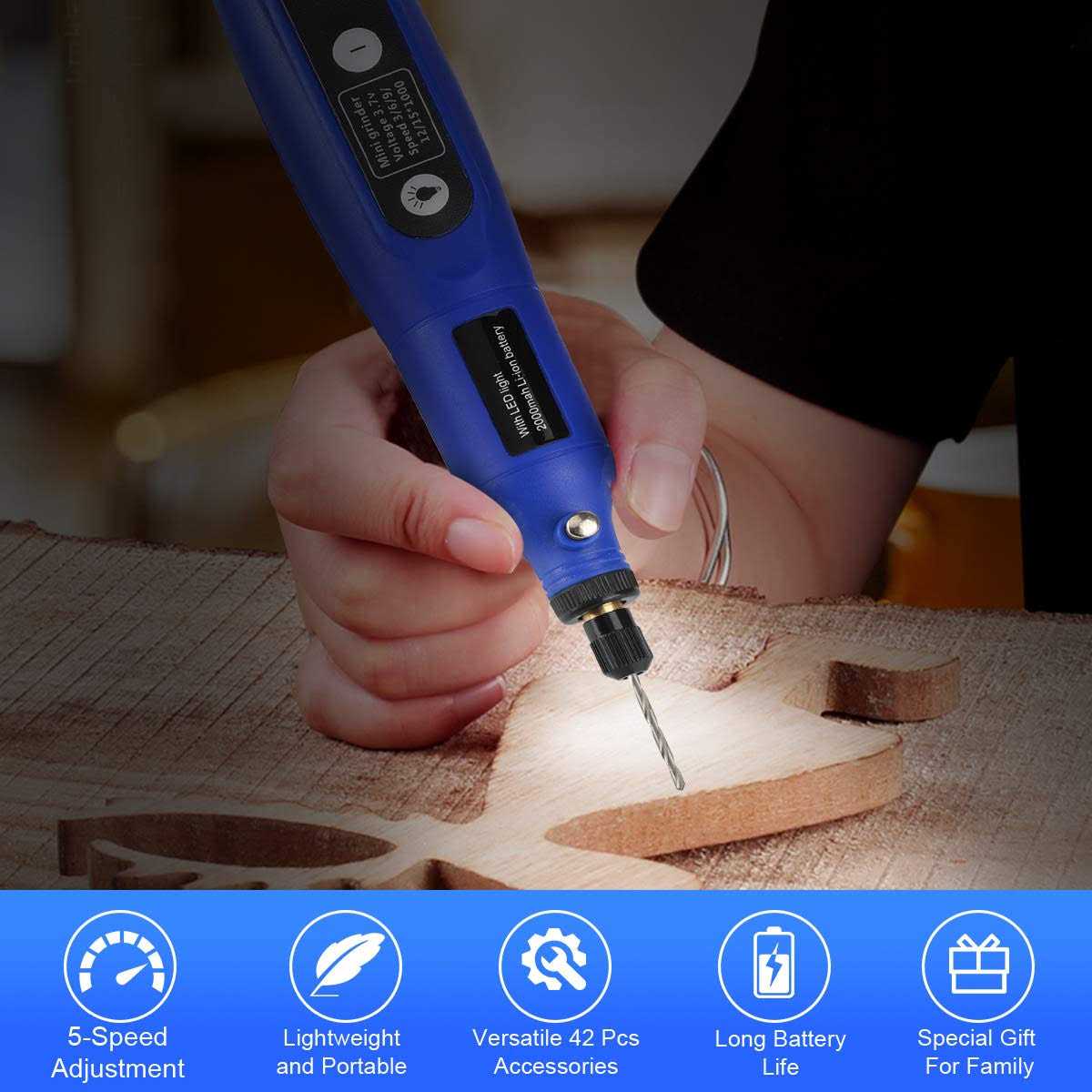 BYWOKY Cordless Rotary Tool, 3.7V Li-ion Mini Power Rotary Tool 5-Speed with 2.0 Ah Battery, Front LED Lights and 42pcs Accessories Kit for Drilling