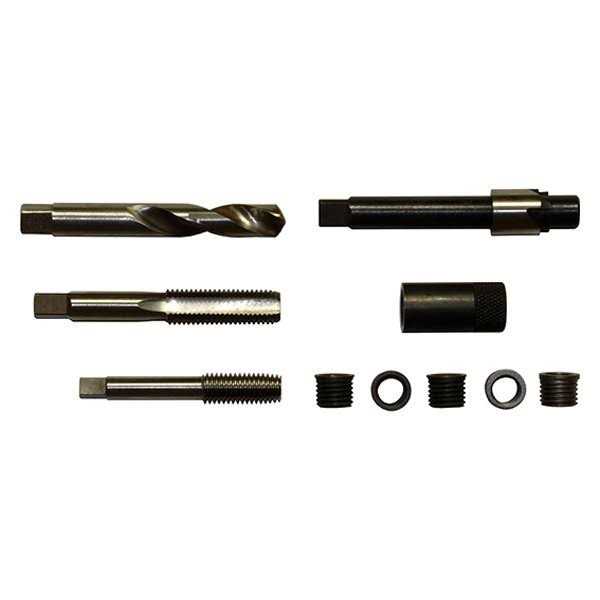 Kit designed to repair aluminum oil pans with damaged drain plug threads size M12x1.75 commonly found in GM Ford and Mazda. Effective in repairing stripped drain plugs without leakage. The inserts included allow for the original drain plug to be used instead of aftermarket plug at a different size.
