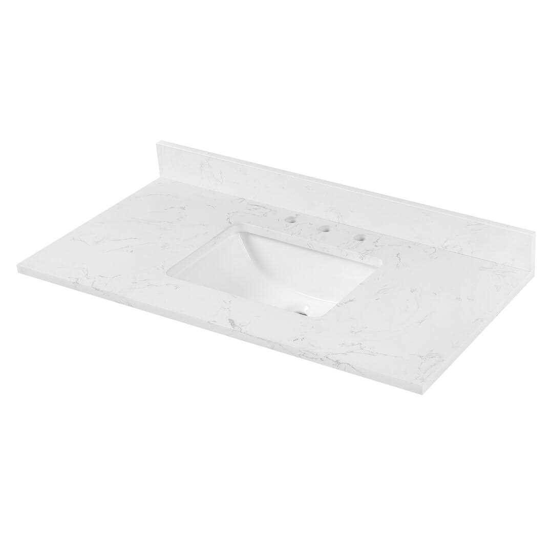 Cala white engineered stone bathroom vanity top will provide you a stunning and clean bathroom with a modern straight edge profile. Easy installation and low maintenance, it also comes with gray veining that mimics Carrara White marble. The vanity top includes a 4 in. H back splash and a single rectangular sink. Universal used side splash is sold separately and it can be installed on either left side or right side.