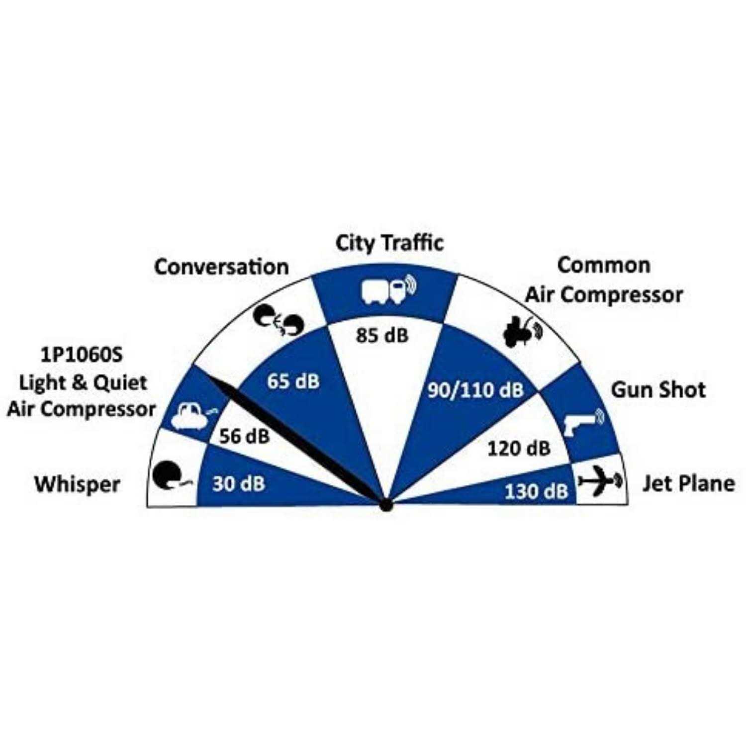 The California Air Tools Light & Quiet 1P1060S portable air compressor is designed to be one of the quietest air compressors in the industry having only 56 decibels of sound. The 0.6 HP motor operates at only 1680 RPM creating less noise and less wear. The new “IP” ultra quiet & Oil-Free motor is a single piston pump design is engineered for high performance and durability. The 1.0 gallon steel air tank is lightweight (29.5 lbs) making it very easy to transport. The 1P1060S air compressor has a Oil-Free single piston pump designed to have a life cycle before wear of 3000 Plus hours compared to other comparable air compressors with life cycles of 250 hours or less. The Oil-Free pump allows for use in a variety of different temperatures (cold) and uneven terrains the 1P1060S produces 1. 2 CFM @ 90 PSI allowing you to use Staple guns, Brad nail guns, finish nail guns, nail guns, airbrushes and blow guns. This air compressor is great for the garage and perfect for cleaning and inflating tires, beds, toys and sport balls. This air compressor is ideal for anyone working inside where noise is a major filling standard car tires. These models will take (approximately) 1 second for each (1) PSI added to the tire.