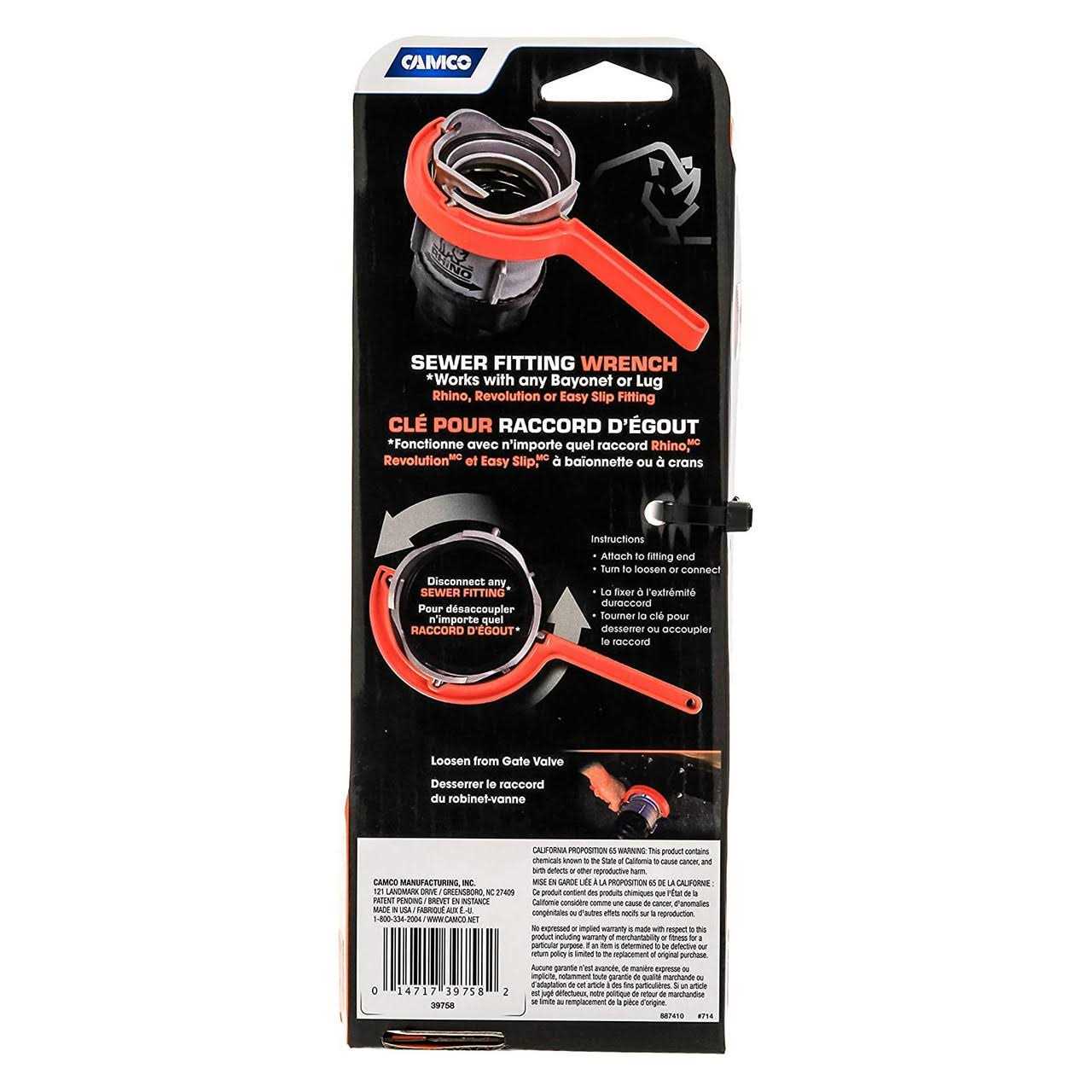 Sewer Hose Carriers & Fittings by Camco. Details:Say goodbye to stubborn RV sewer fitting connections with Camco’s RhinoFLEX Swivel Fitting Wrench Set! Perfect for when you need to disconnect fixtures from a sewer outlet or dump station, this set includes (2) wrenches designed to fit Rhino, Revolution, and Easy Slip swivel bayonet/lug RV sewer hose fittings. Made of durable and lightweight reinforced materials, these sewer fitting wrenches feature an ergonomic design and are built to last. Plus, they’re incredibly easy to use— just attach the wrench to the fitting and effortlessly loosen or connect it. Never again worry about difficult camper fittings with the RhinoFLEX wrench set!