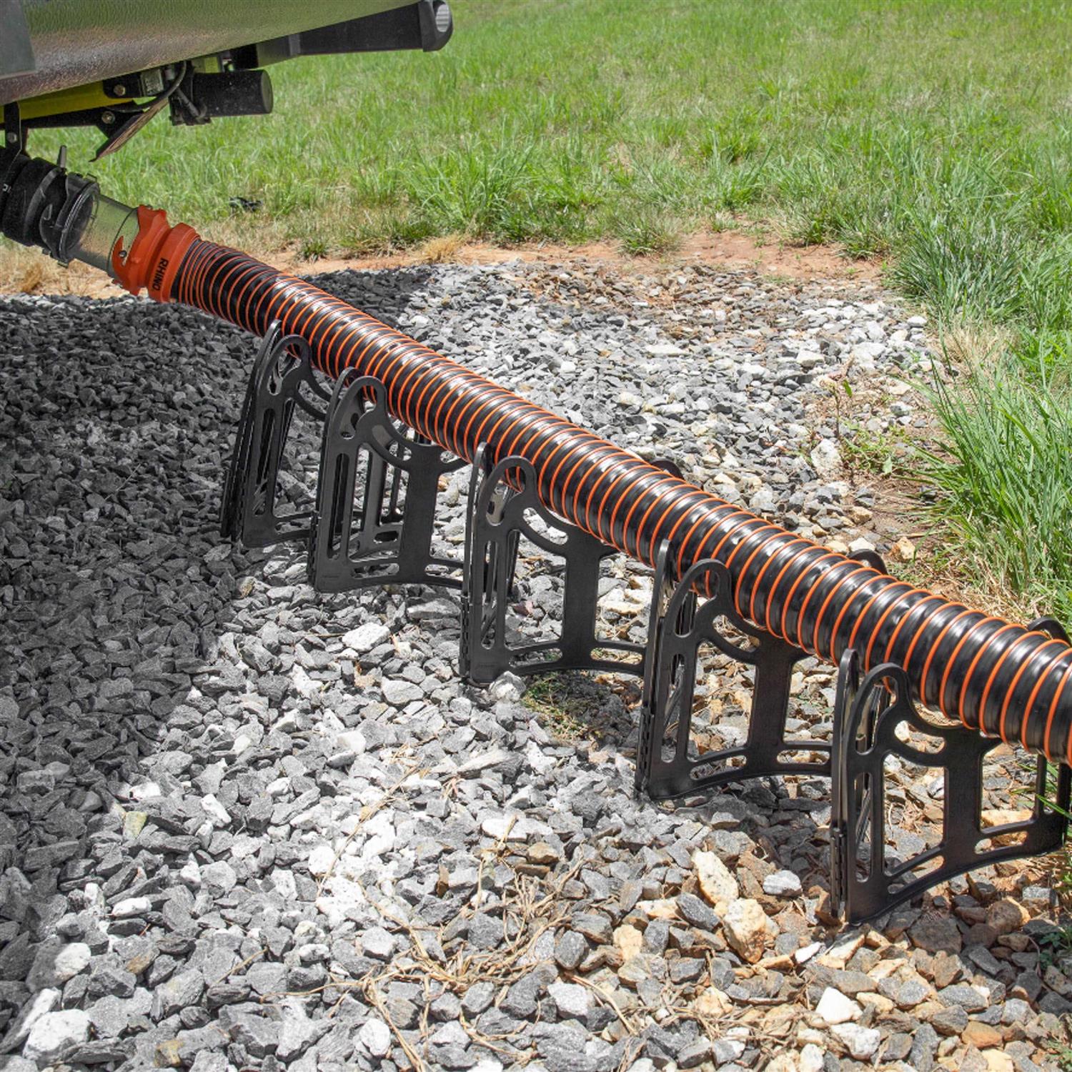 The collapsible Sidewinder cradles your RV’s sewer hose off the ground to prevent damage. The flexible support can be maneuvered around obstacles, and the sloped design helps prevent clogs in the hose. The included handle offers easy transport. The added height also provides increased visibility to help prevent your hose from being accidentally crushed. The sloped design of the Sidewinder ensures that the sewer tubing maintains a downward incline all the way from the beginning of the system to the end, thus ensuring that no waste gets clogged in the hose. The Sidewinder’s snap-fit hinges lend durability to the structure and help prevent it from creeping closed after it is set at your desired length. These same hinges provide the system flexibility to maneuver around obstacles in the path of the hose. The 2-1/2″ deep grooves cradle your sewer hose off the ground, keeping it away from damaging elements that could cause pin holes or tears in the lining. Setting up the Sidewinder is as easy as removing the included handle and extending it to your desired length before laying your sewer hose in the cradles. When it’s not in use, the Sidewinder collapses to just 10″ for convenient storage, and the handle snaps around the compressed system so it can be easily carried.