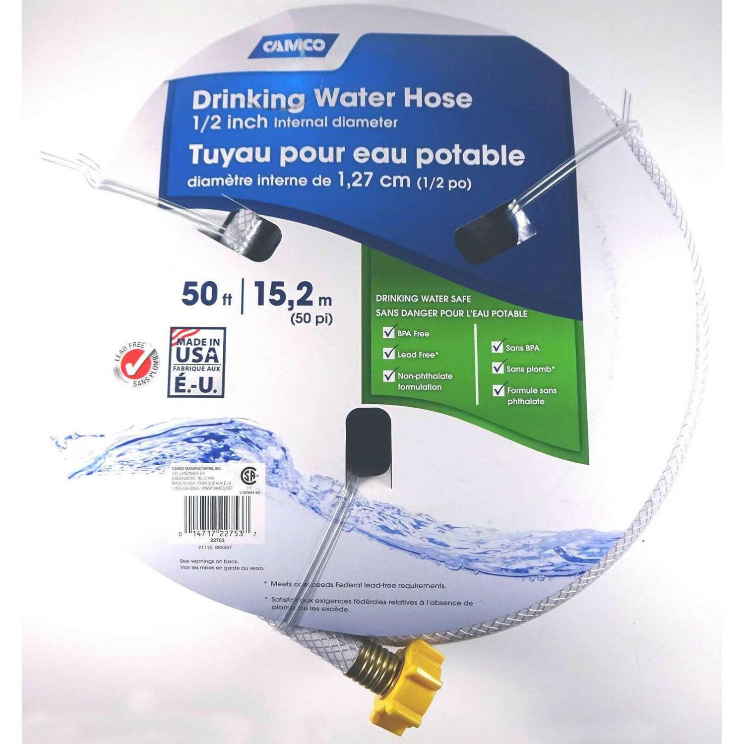 Made with NSF certified hose; drinking water safe Reinforced for maximum kink resistance 50′ long x 1/2″ID Hose is made of PVC and is BPA free Compliant with all federal and state level low lead laws. CSA Low Lead Content Certified to NSF/ANSI 372 Camco’s TastePURE 50′ x 1/2″ID Drinking Water Hoses are reinforced for maximum kink resistance. Especially useful when hooked with a Y-valve to your main faucet. Made with NSF certified hose; drinking water safe. Hose is made of PVC and is BPA free. CSA low lead content certified. Complies with Californias AB1953 and Vermont Act 193 Low Lead Laws.